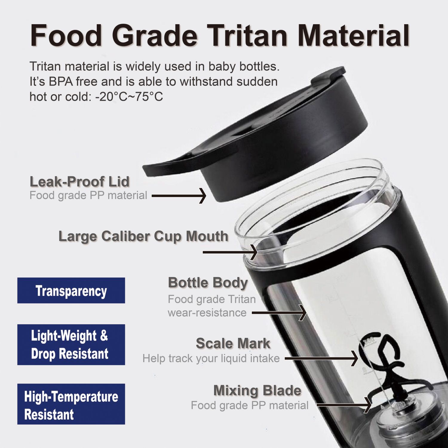 - food-grade tritan material: Tritan gives you the transparency of glass and the lightness of plastic, shatter-proof and odor-resistant