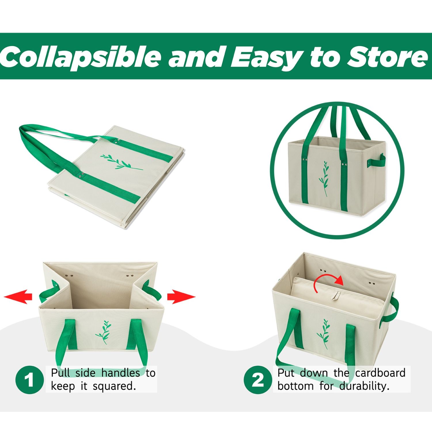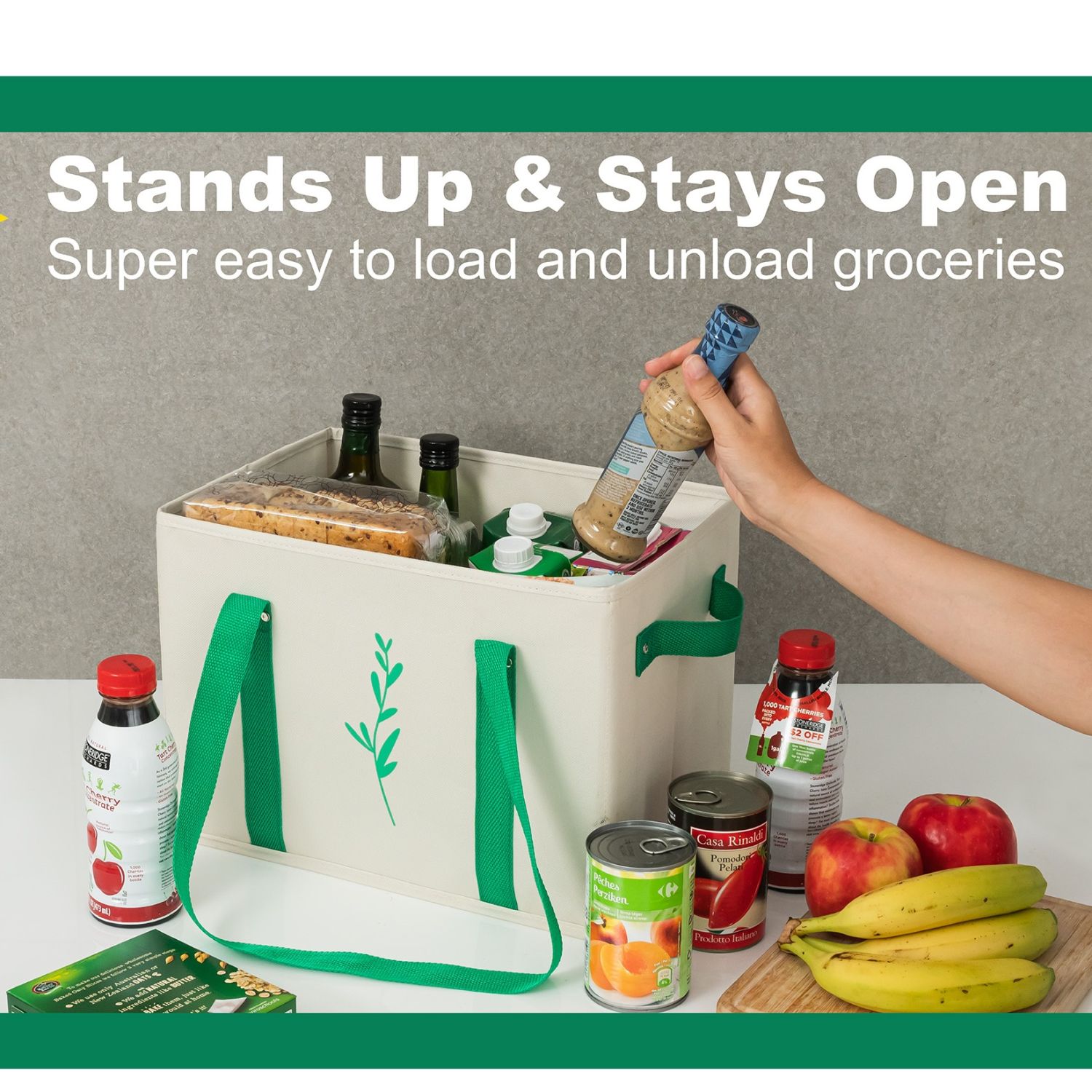 Makes shopping easy: with a rigid box structure, our reusable grocery bags stand up and stay open - super easy to load and unload compared to ordinary floppy reusable bags - long handles let you easily carry tall items or sling over your shoulder, while side handles allows you to carry with two hands from one location to another.