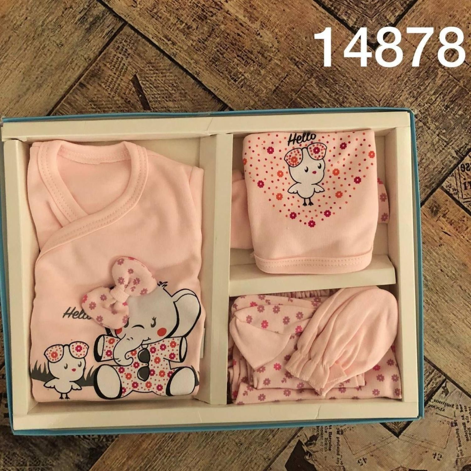 Baby good quality 6 piece set include bib, beanie, long-sleeved vest, bottom, a pair of gloves.