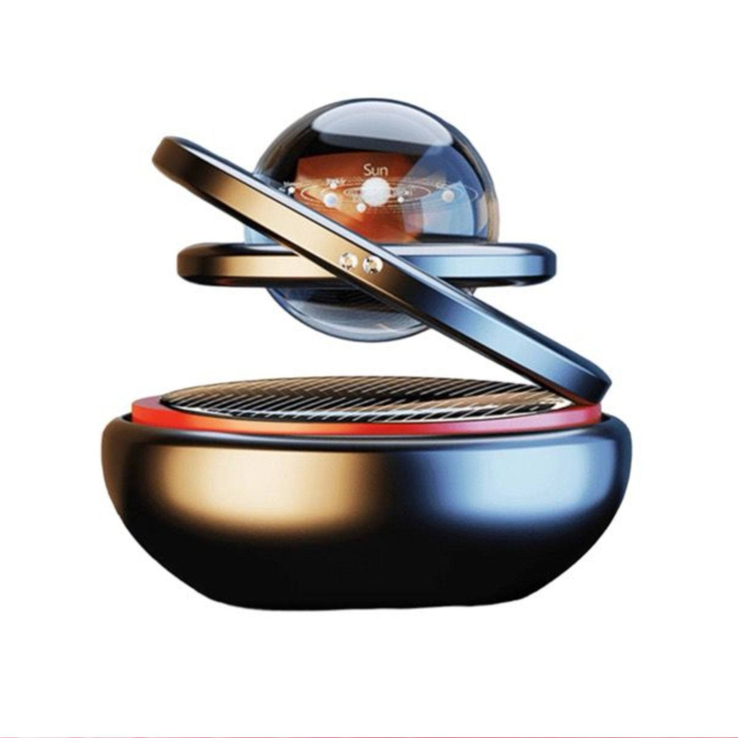 Solar Power Air Freshener directly powered by solar energy, which drives the motor to rotate, full of sense of technology, no need of cell, eco-friendly.Products need direct sunlight.Ocean Perfume: mild and non-irritation fragrance, pure plant extraction essential oil, safe for children and pregnant woman, fill the carriage with good smell, dispel peculiar smell and cover smell of cigarettesFashion High-Tech Desgin: Two rings to rotate cystal ball, like a interstellar screen to show on, with solar powerCompact size for space-saving: Without occupying much space, you can easily place this diffuser on your desk, countertopEasy to install: unscrew the cover, put the perfume pad into and screw the cover, tear the tape to fix the air freshener