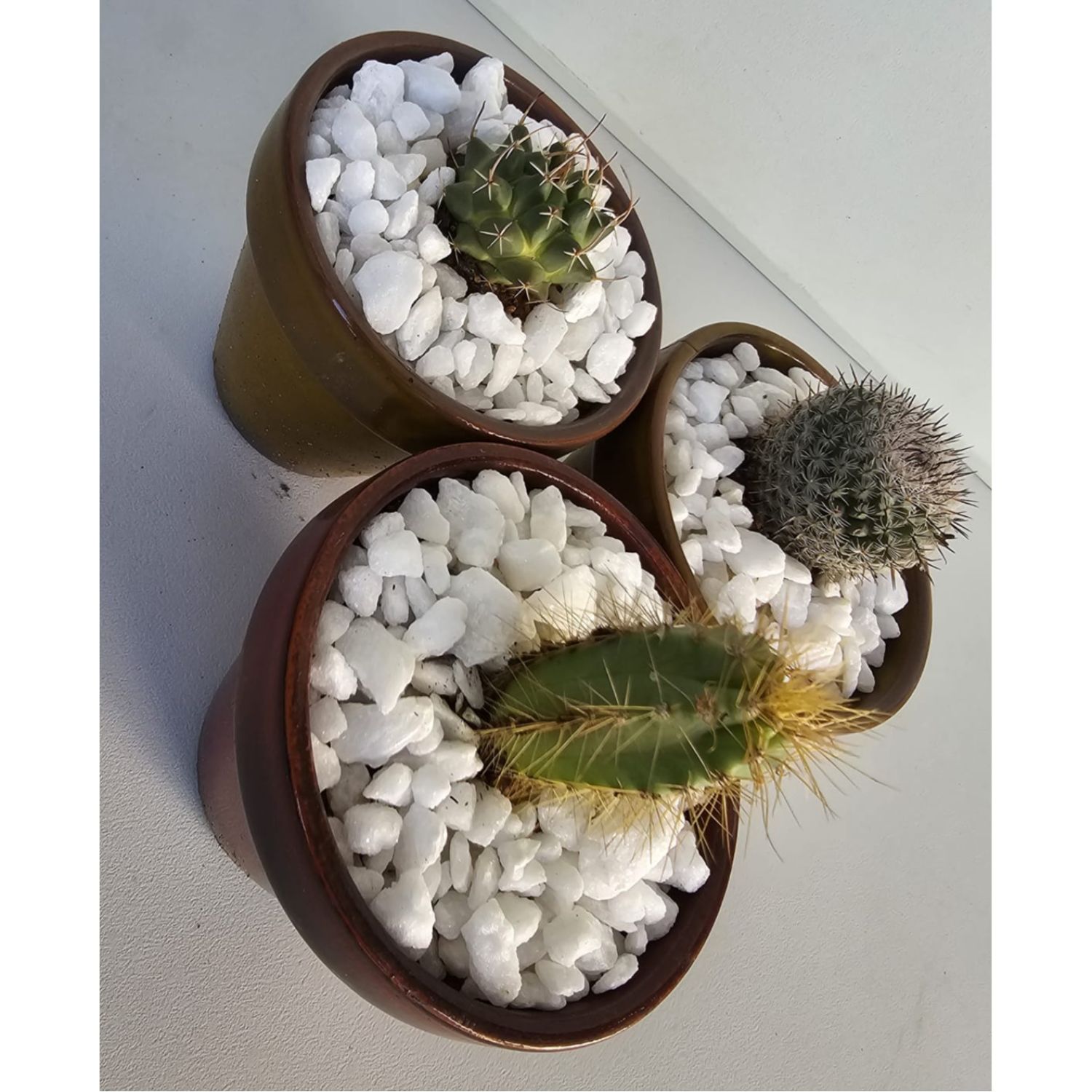 Various Cactus plants in glazed colour pots . Decorated with white marble stones. This 3 pot set is idea for windows or as table centerpiece. Easy to maintain and requires limited watering.