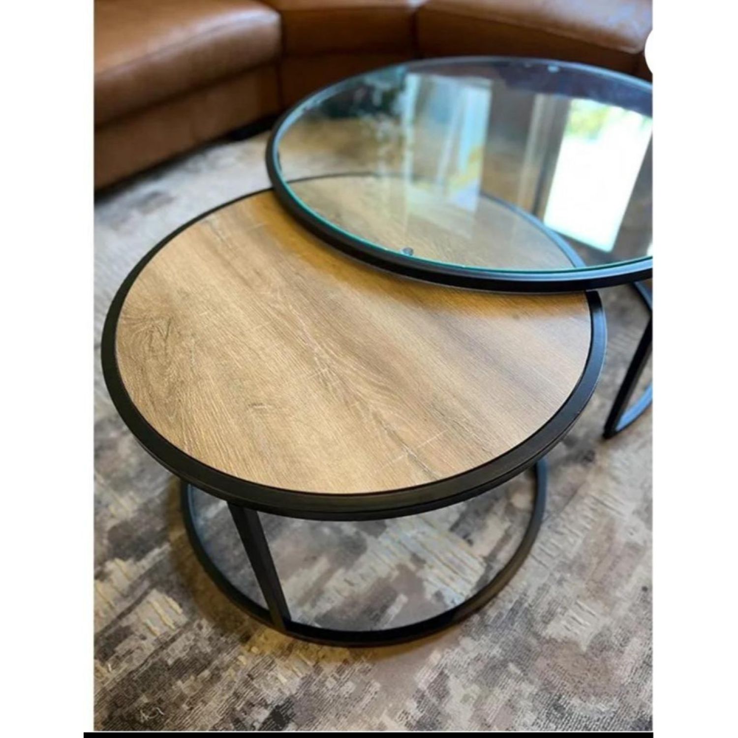 Can't decide between glass and wood? The Wood and Glass Nesting Coffee Table offers a stylish and versatile solution, blending the warmth of natural wood with the modern appeal of glass. This nested mixed-material design provides the best of both worlds. A smaller metal table with a reclaimed elm top neatly fits beneath the larger glass and brushed metal table. Supported by a minimalist iron base, the smaller table nests under the larger tempered glass one, revealing the beautiful inlaid sunburst mahogany wood top with a natural open grain finish. You can keep them nested to save space or spread them out for a larger tabletop.