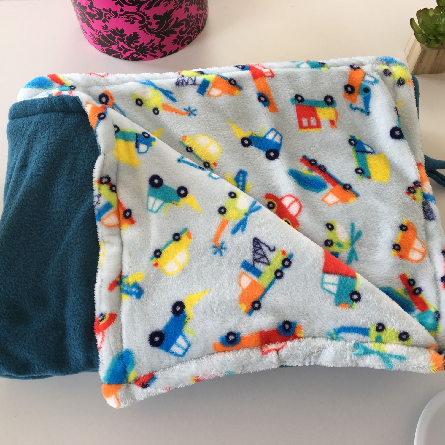 The Teal and Cars print Blankey is reversible for your convenience. It is 140cm x 140 cm large. It is made from high quality fleece for it to last while keeping you warm throughout its life.