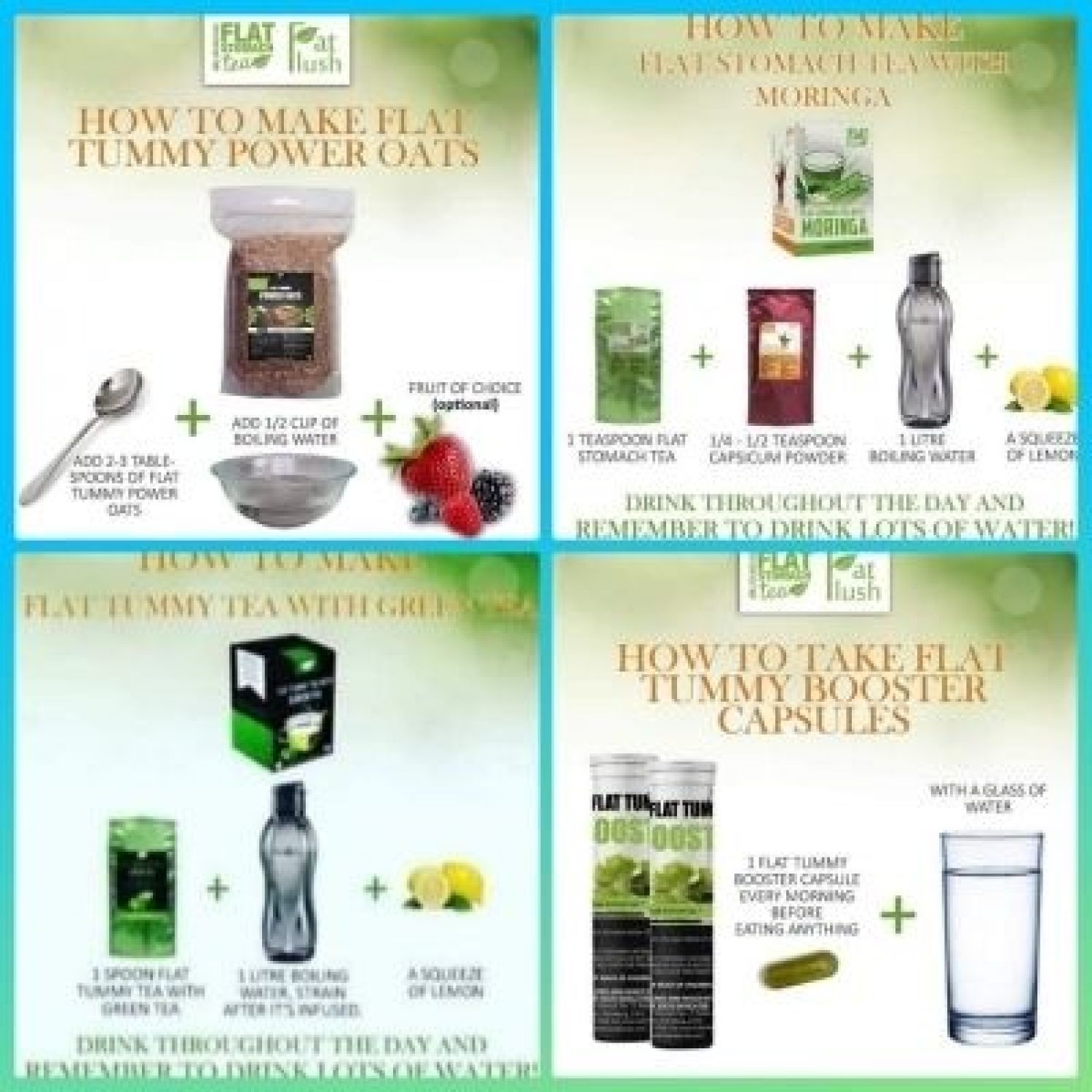 The Flat Tummy Transformation box is a combo that contains one Flat Tummy Tea pack with Moringa Tea, 8 x Fat Flush Capsules one Flat Tummy Power Oats packet. The combo is a 30 day supply and is designed to kick start your journey towards a beautiful flat stomach.
