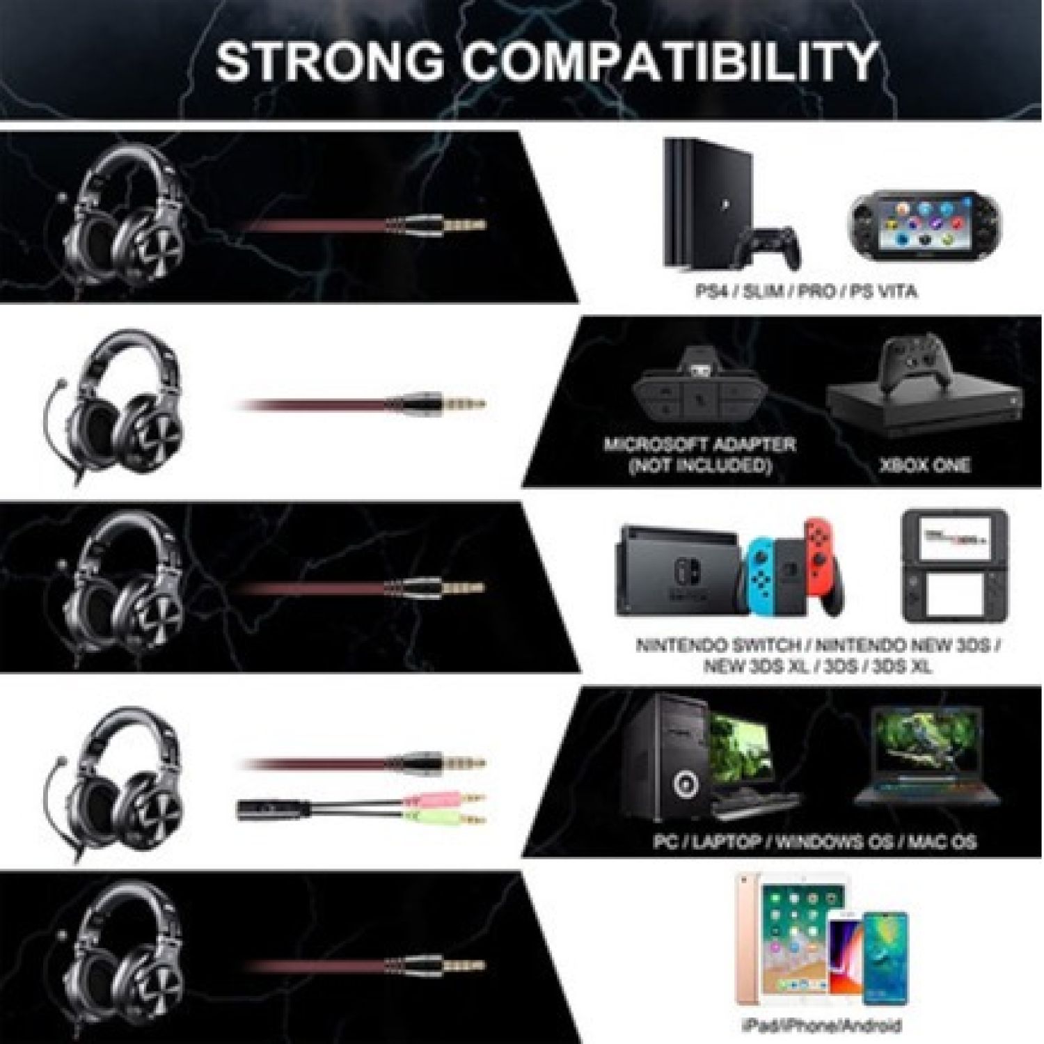 A standard-sized 6.35mm plug, a 3.5mm plug and a 3.5mm splitter cable adapter are included. Compatible with all devices have 3.5 or 6.35 audio jack, like smartphone, laptop, PC, PS4, Xbox One, AMP, electric guitar/piano/drum, etc
