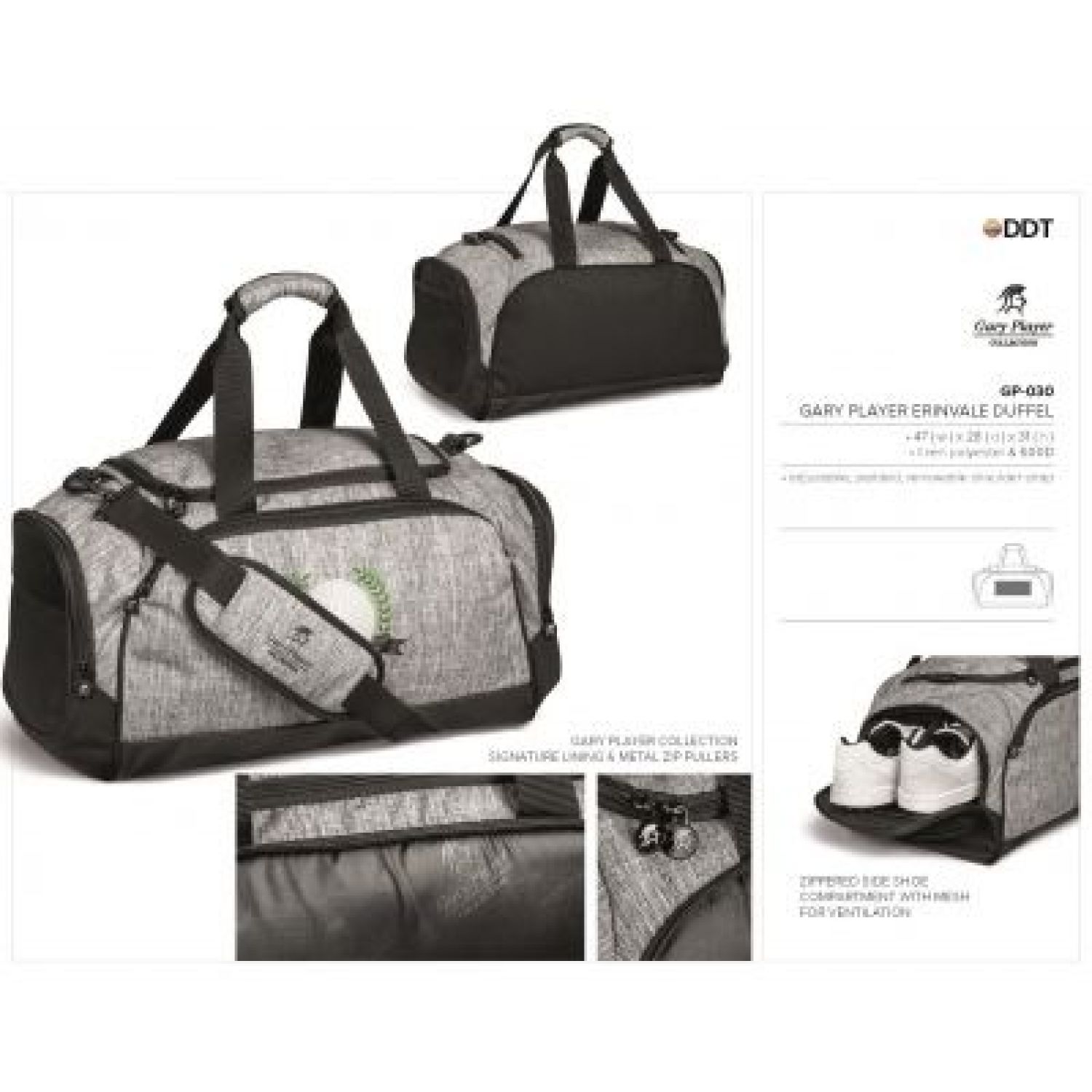 Gary Player Erinvale Duffel. 47 ( w ) x 28 ( d ) x 31 ( h ) linen polyester & 600D • adjustable, padded, removable shoulder strap • Gary Player Collection signature lining & metal zip pullers