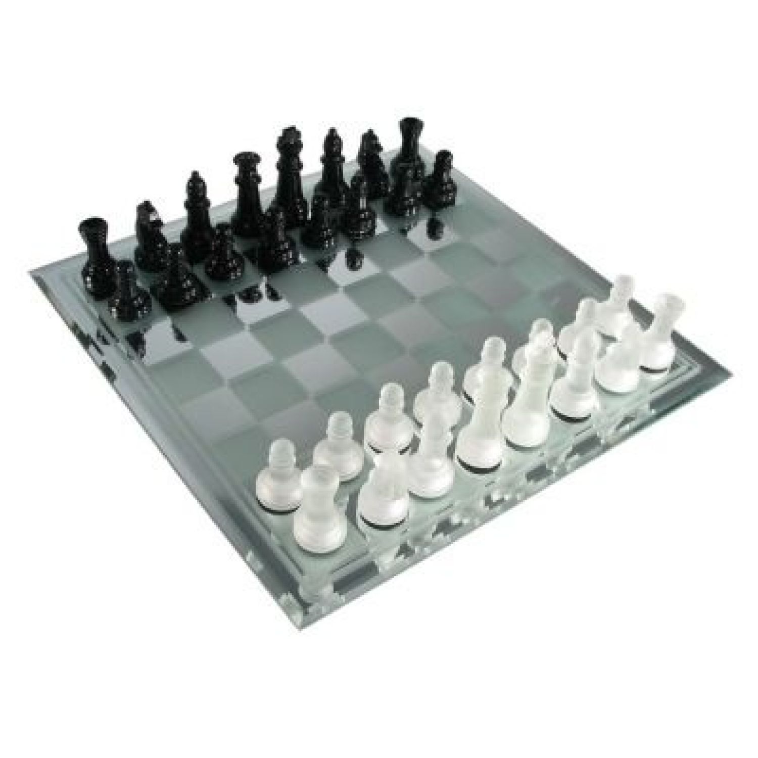 The glass chess pieces are a frosted and transparent, designating each side of play.
