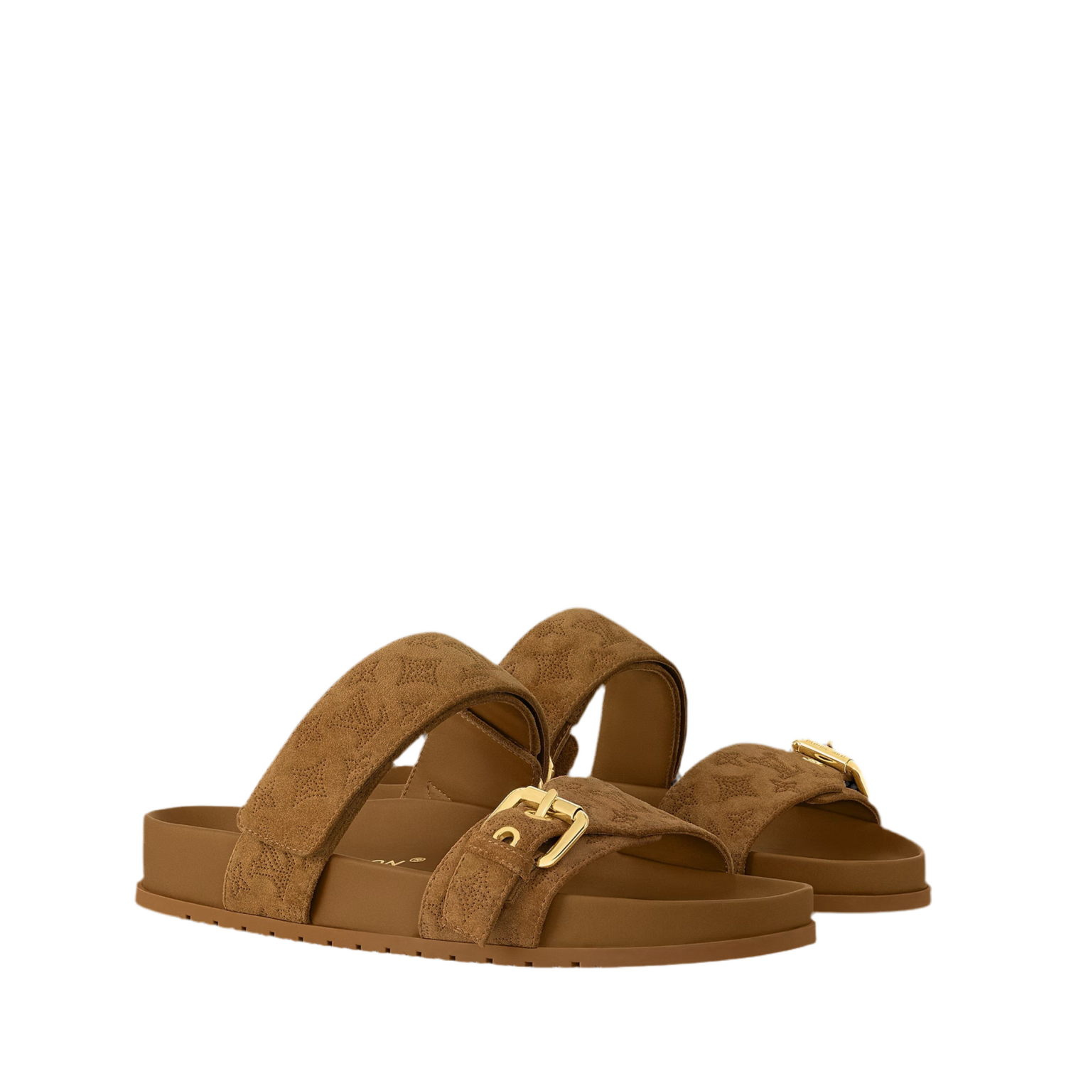 The Bom Dia flat comfort mule is revisited this season in suede goat leather with Monogram perforations, coordinating with the Mahina leather goods line. Both stylish and practical, this model features two adjustable straps: one with velcro, the other with a Louis Vuitton-engraved buckle. Its padded anatomic insole offers all-day comfort.