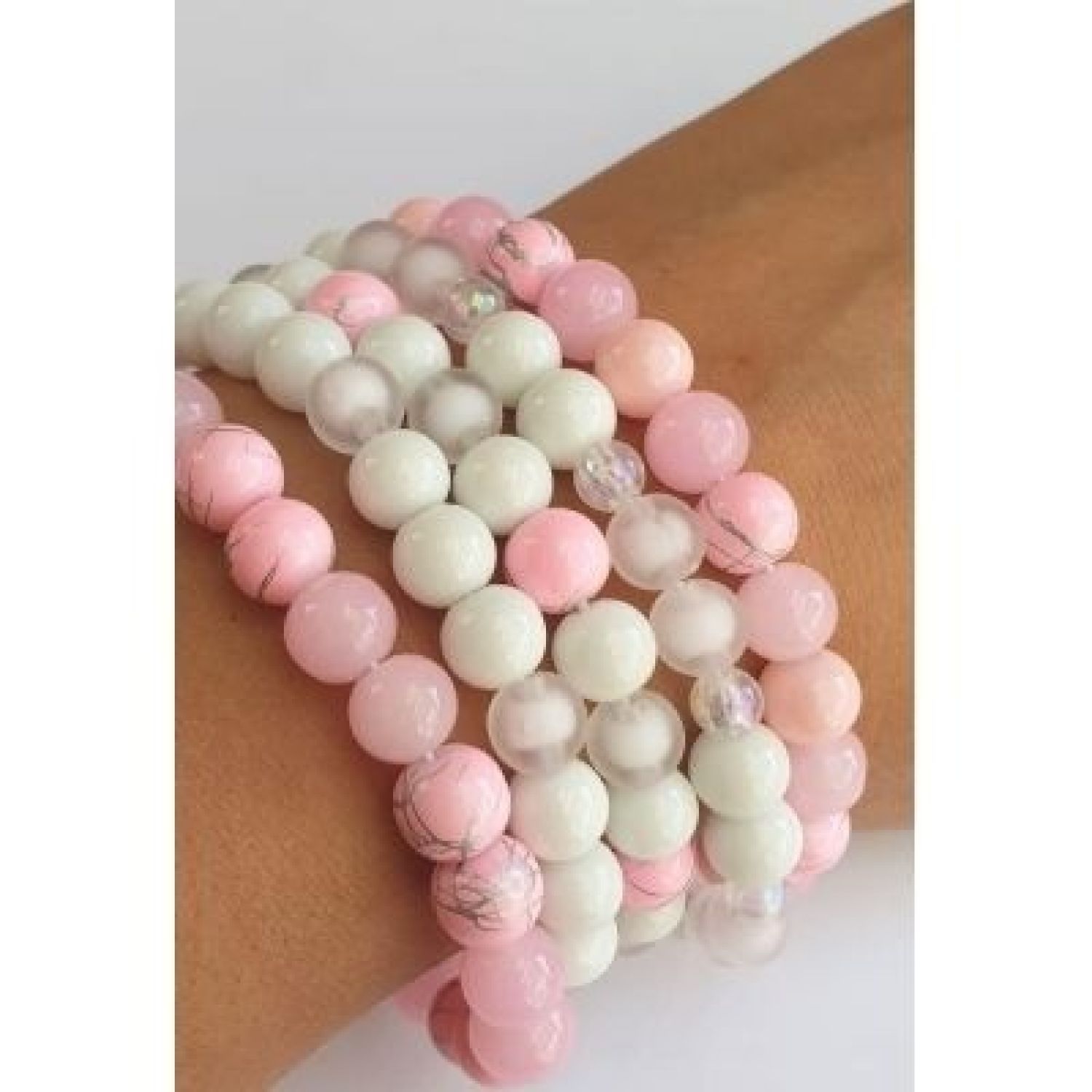 Set of five different beaded bracelets in soft Pink and White. Made from quality beads. Elastic bracelets for a comfortable fit.