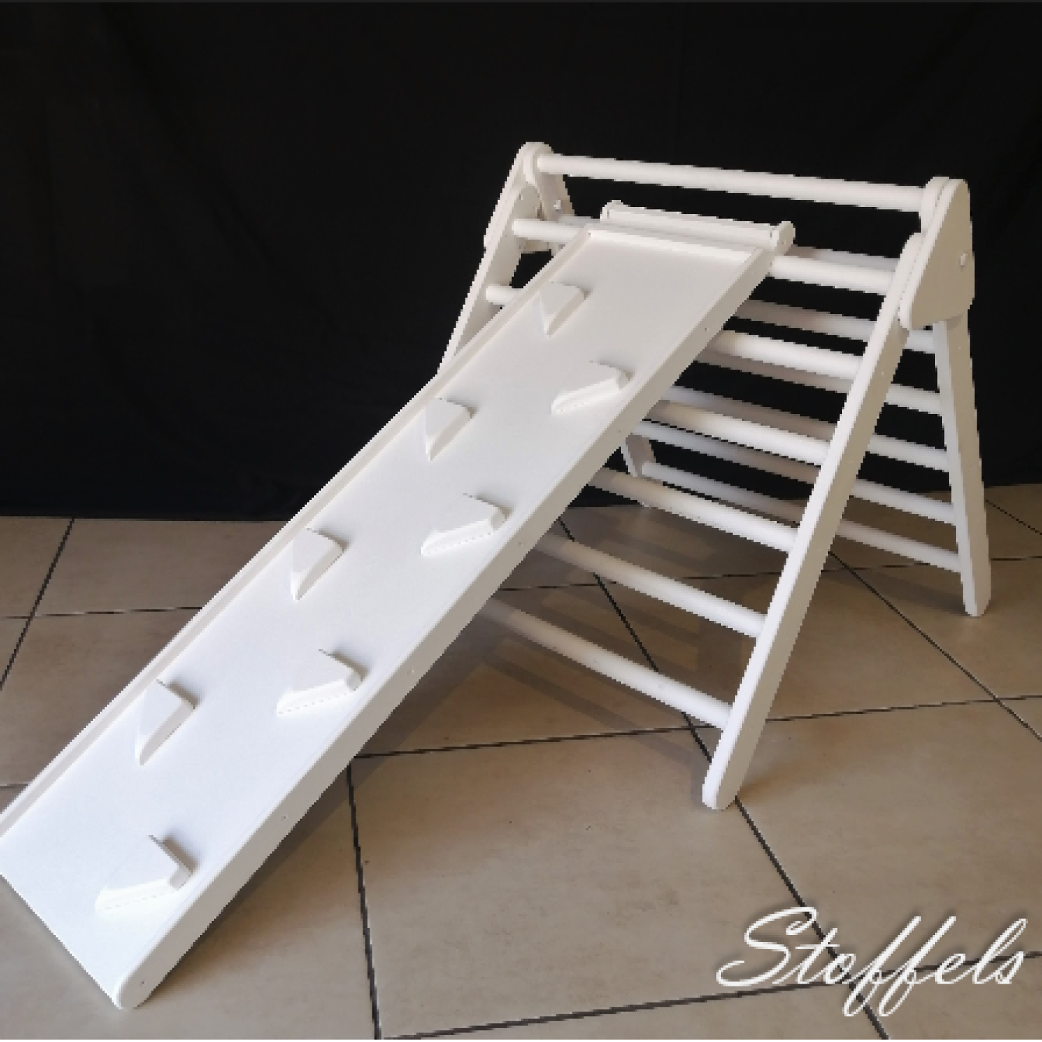 This top quality Montessori foldable wooden climbing frame, known as a Pikler Triangle, has a removable double-sided slide and rock-climbing ramp, to help toddlers develop and improve their gross motor development and creative play skills. It's position can be adjusted to any height and angle on the triangle.