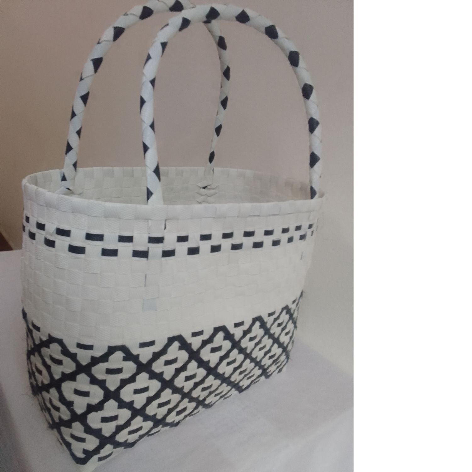 This handmade basket is a medium-sized, rectangular shopping basket woven from plastic material in an African style. It is perfect for all occasions and features a natural finish with a handle for easy carrying. Made in South Africa, this original piece is easy to care for and clean with a damp cloth. The basket weighs 1kg and is sure to add a touch of authenticity to any home decor or collection.