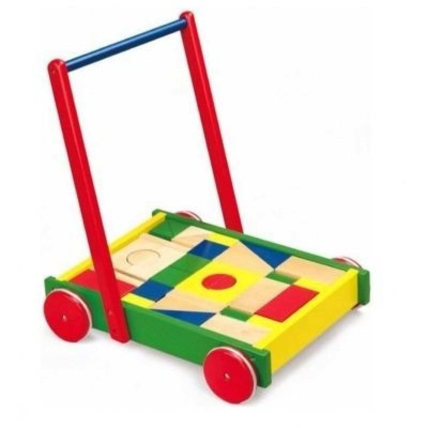 This classic, wood, push-along baby walker contains 36 pcs wooden blocks of solid colours and different shapes. Secure non-slip rubber ring on the wheel offers extra confidence.