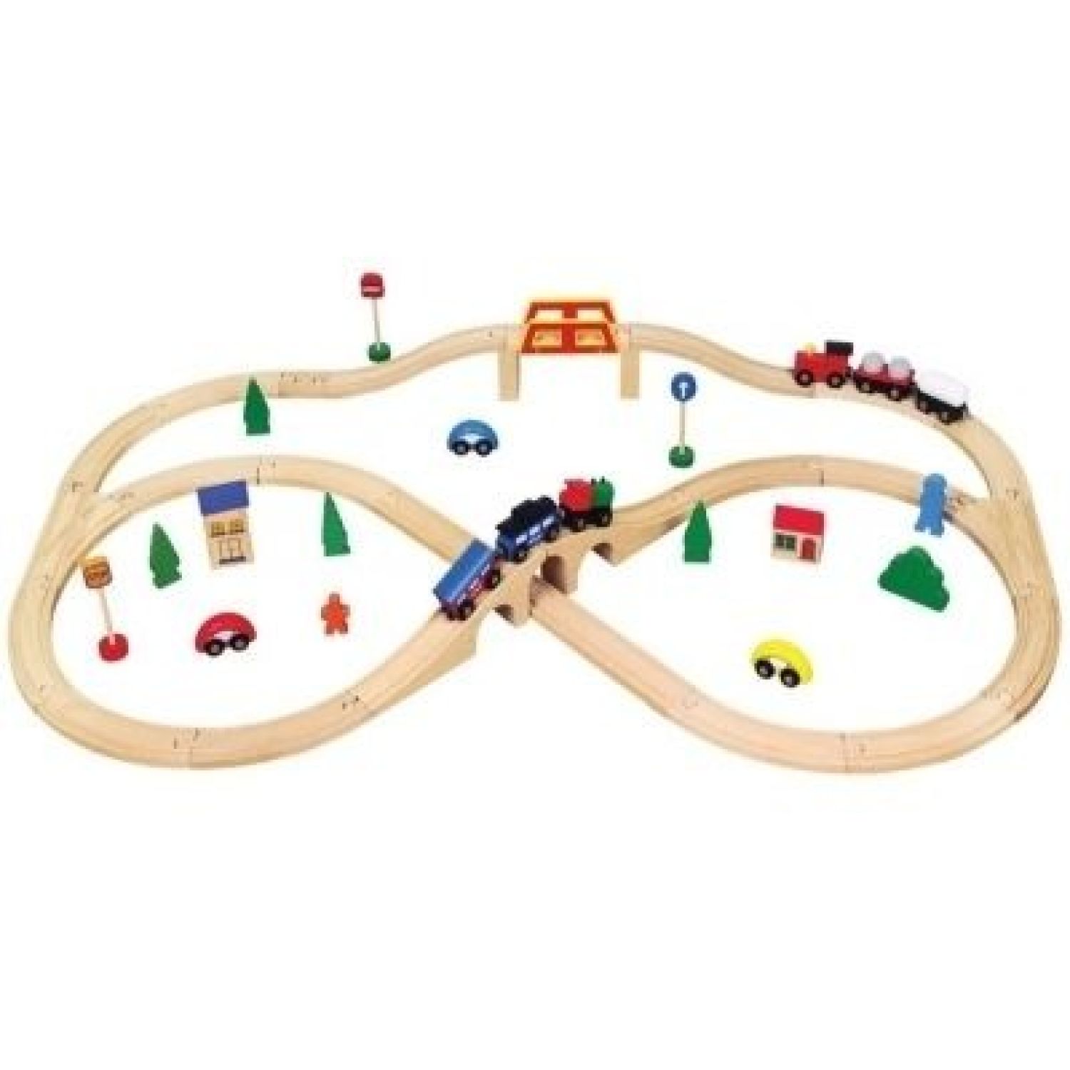 Wooden train set complete with interlocking track, bridge, houses, bushes, trees, cars, traffic signs and 2 play figures. The track is made out of beechwood. Encourages creativity and hand-eye coordination skills. Measurements of the product are 41,5 x 28,5 x 7,5 centimetre.