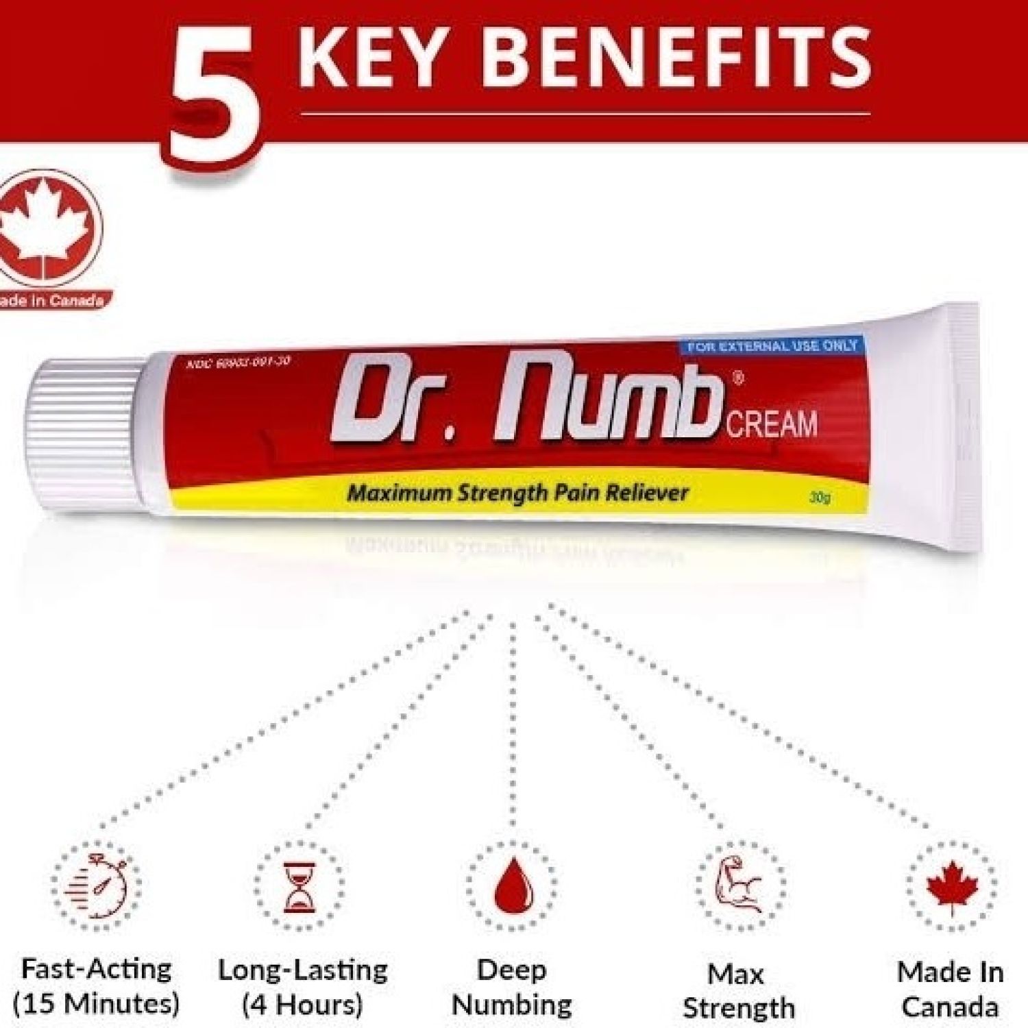???????????? ???????????: Dr. Numb 5% Lidocaine Cream with Vitamin E produces temporary numbness or loss of sensation of the skin and its surrounding tissues.