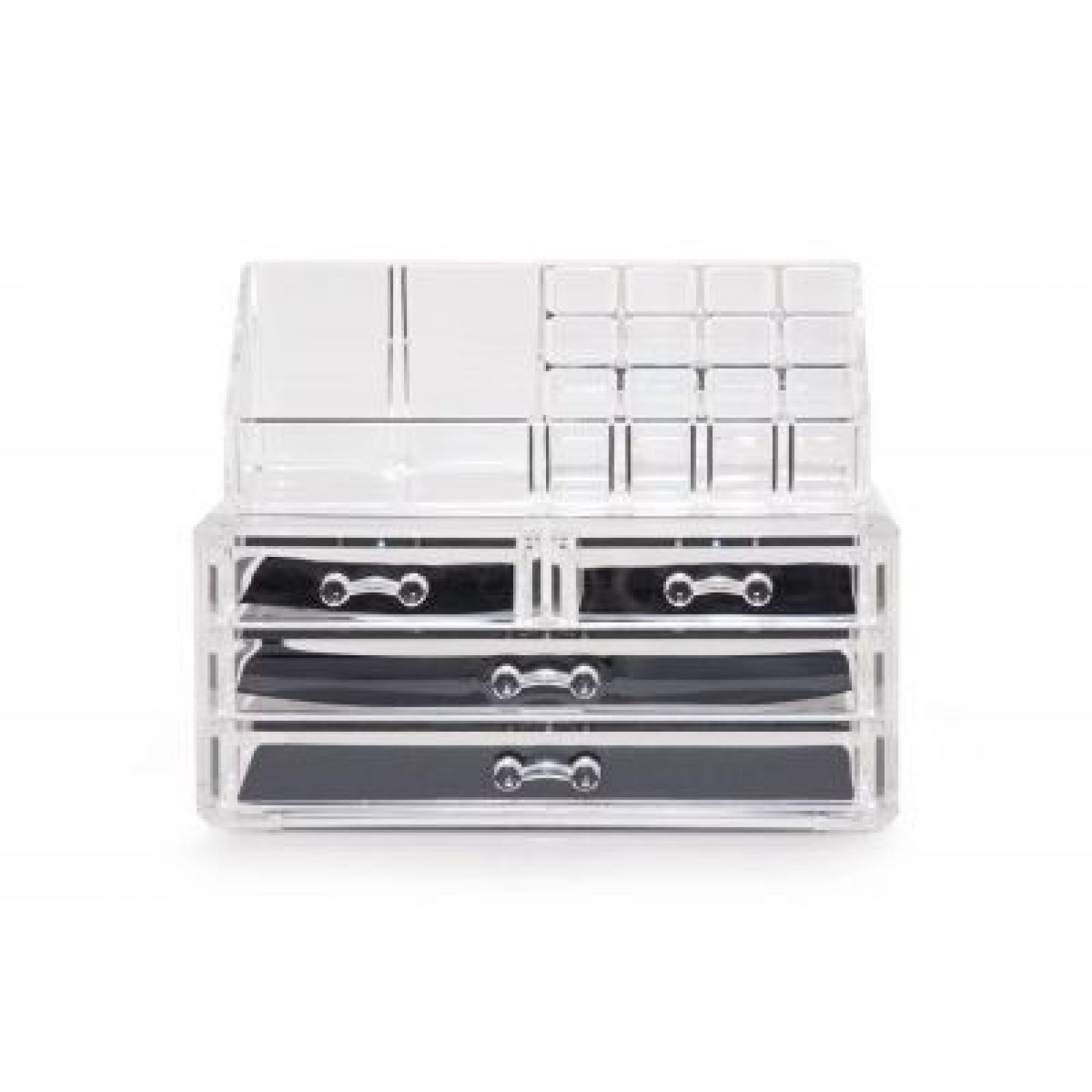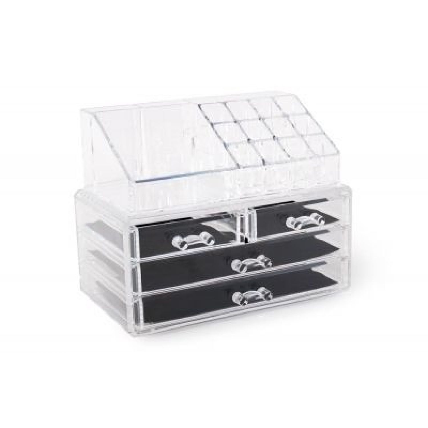 Specifications: - Color: Clear - Material: Acrylic - 12 uniform storage compartments on the top for lipsticks, nail polish and more - 4 other multi-size compartments on the top for blush, foundation, concealer, eye shadow, liner, mascara, brushes and more - 4 lower drawers for suitable cosmetics and jewelry - Assembly: NO - Dimensions: 24 x 14 x 19 cm - Weight: 2.7 Lbs (1.22 Kg)