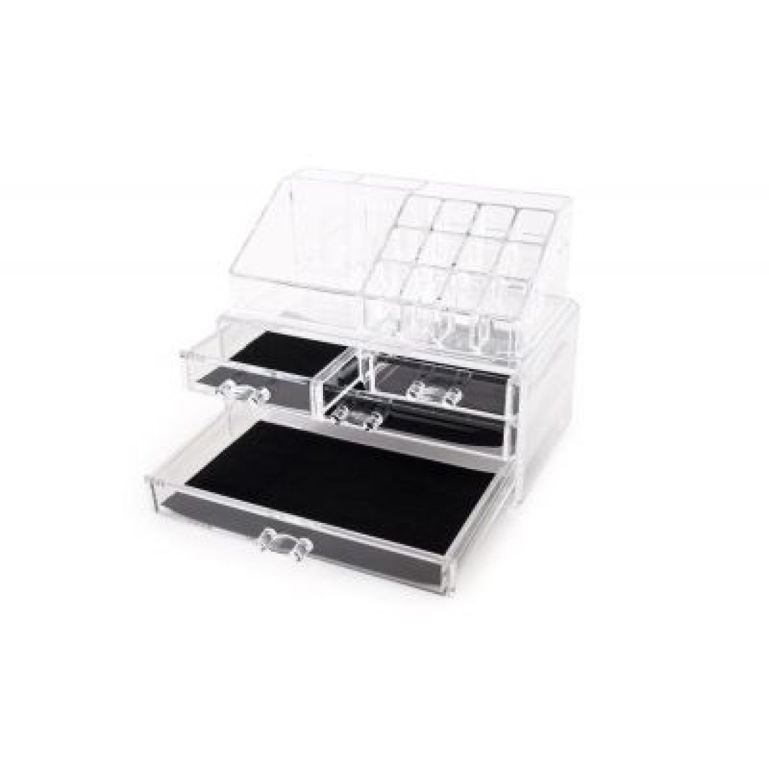 With 16 separate compartments and 4 drawers for make-up essentials and jewelry, this makeup organizer keeps everything accessible and easy to find at your fingertips in clear, durable acrylic. This practical organizer occupying little space on your dresser/counter but enough to holds many shapes and sizes of your favorite moisturizer, blush, foundation, eye shadow, liner, mascara, lipstick, brushes, nail polishes, jewelry and more, while adding a decorative touch to your dressing table or bathroom countertop.