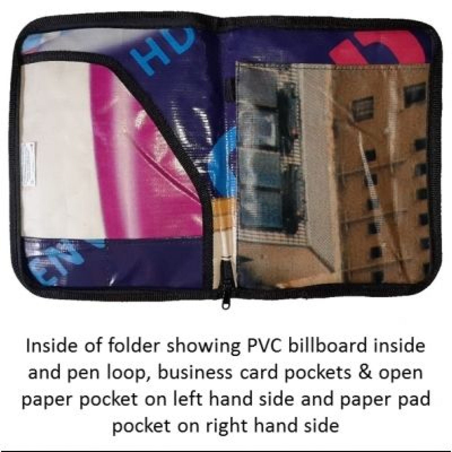 Business card and pen holder and pockets on inside.