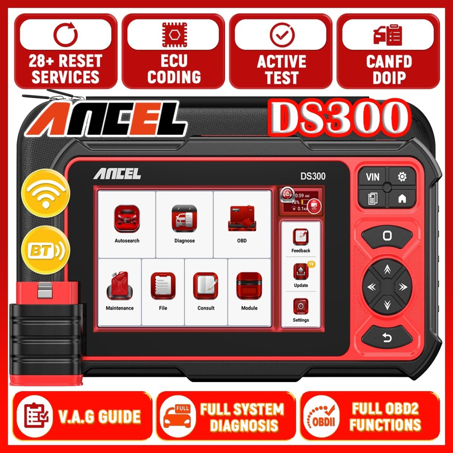 To diagnose car comprehensively, ANCEL DS300 scanner can read DTCs and data streams, perform active test, Coding for ALL systems. For instance: Engines/Auto Transmission/Airbags/Immobilizer/Key Coding