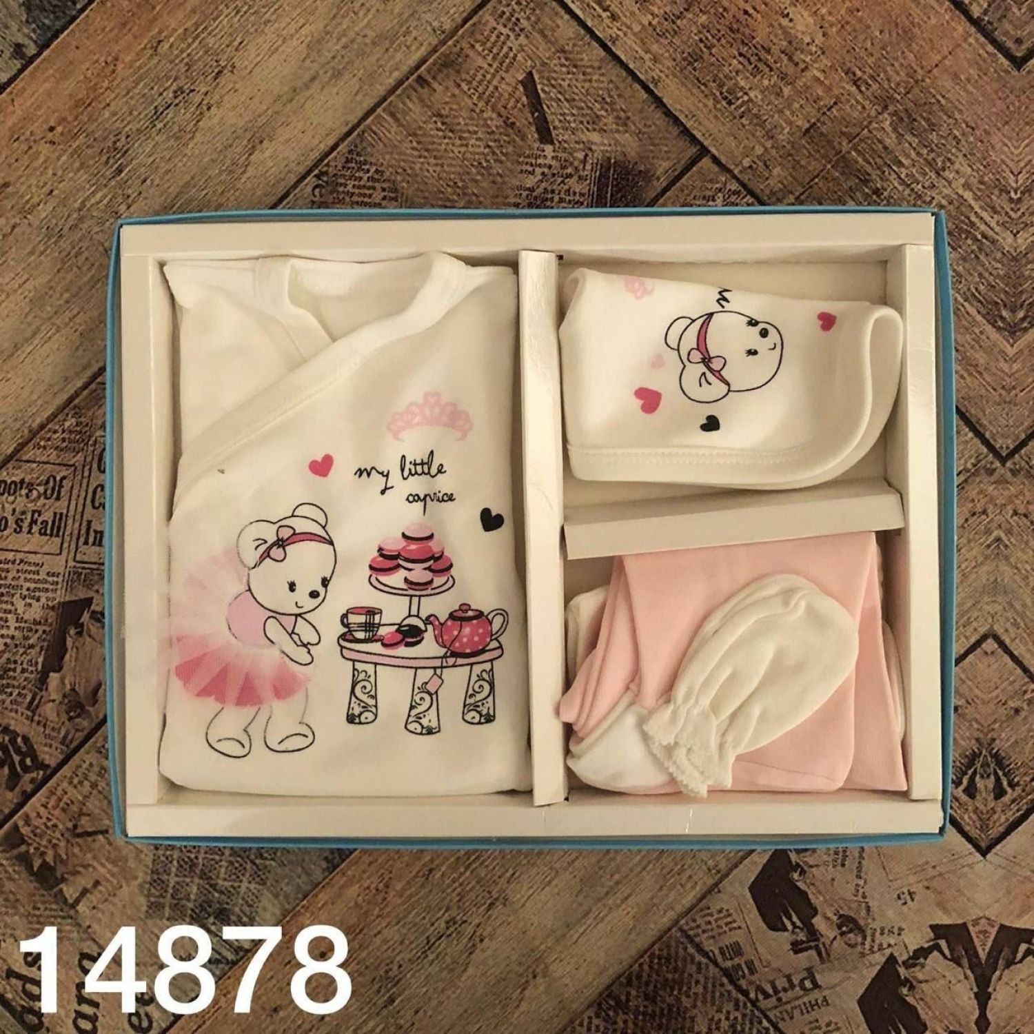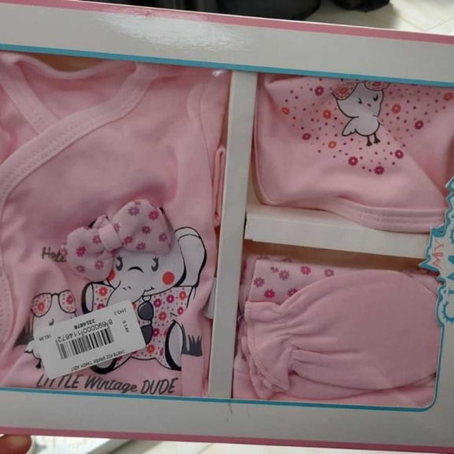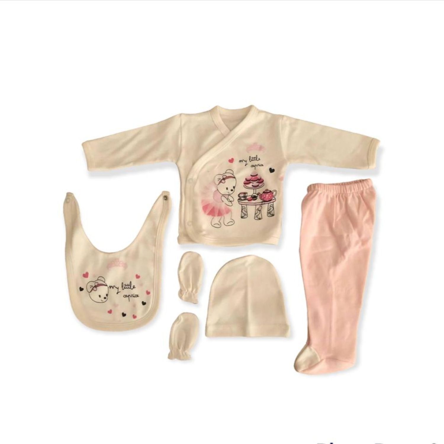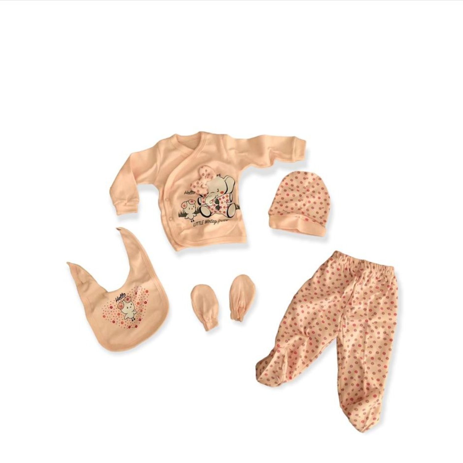 Baby good quality 6 piece set include bib, beanie, long-sleeved vest, bottom, a pair of gloves.