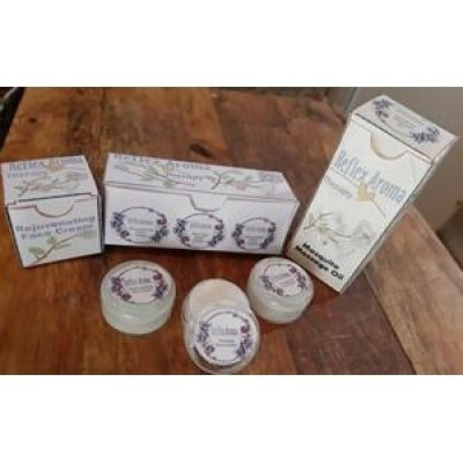 Beautiful gift pack for all ages, totally natural products used, great for travelling as they are in handy 10ml screw cap bottles, the range is Rejuvenating Face Cream, Revitalizing Hand Cream and Energizing Foot Cream, all products are 100% natural cream bases infused with aromatherapy oils, these are specifically small packs as they need to be kept in the fridge and you truely only need a dime sized amount this will last a while if used correctly. If you buy this pack, you will receive the small rejuvenating face cream for free. The massage oil is a special blend of essential oils to keep those mosiqutoe's at bay, can be used by all apply to all exposed areas. Sleep peacefully.