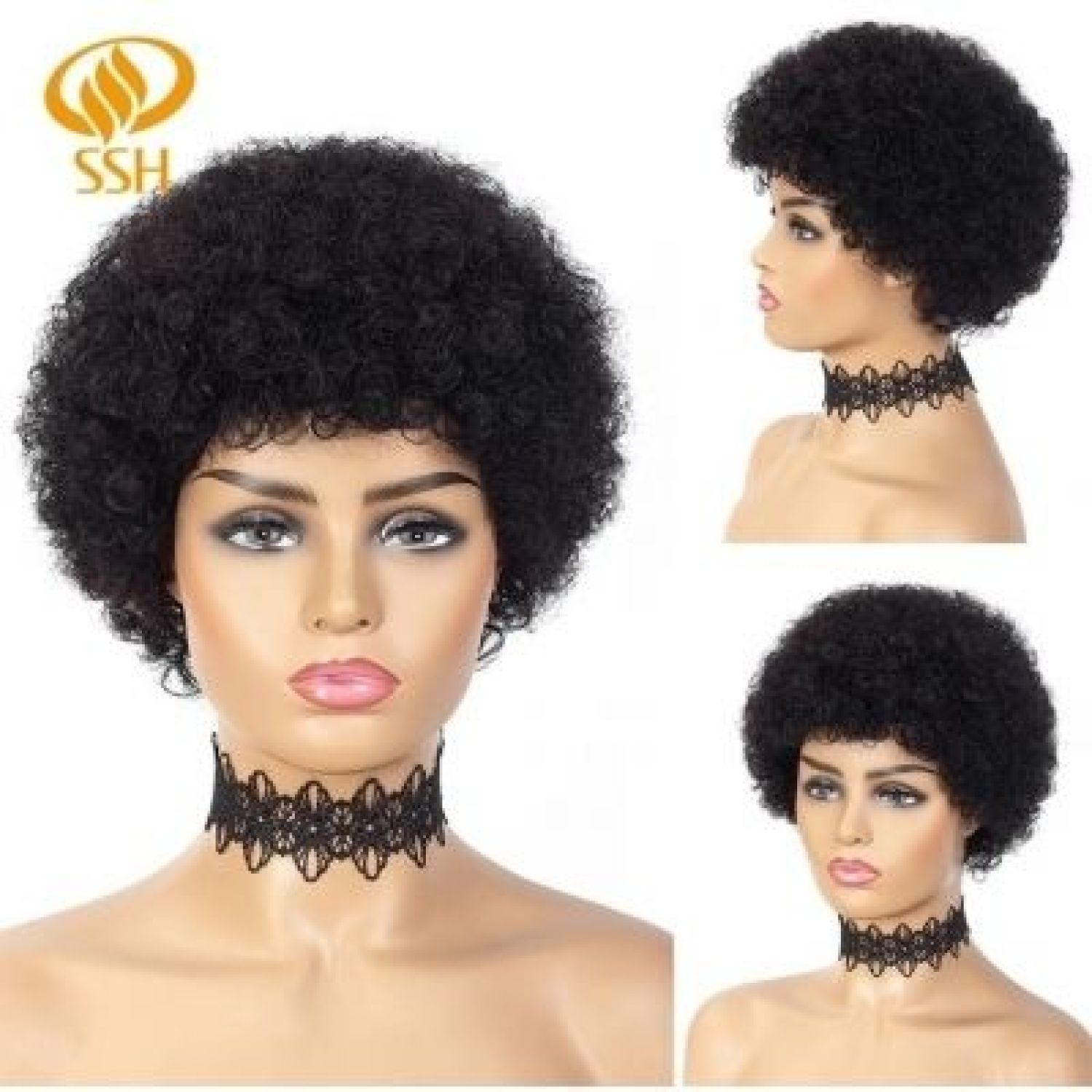 SSH Remy Short Afro Kinky Curly Wave Brazilian Human Hair Wigs Off Black.