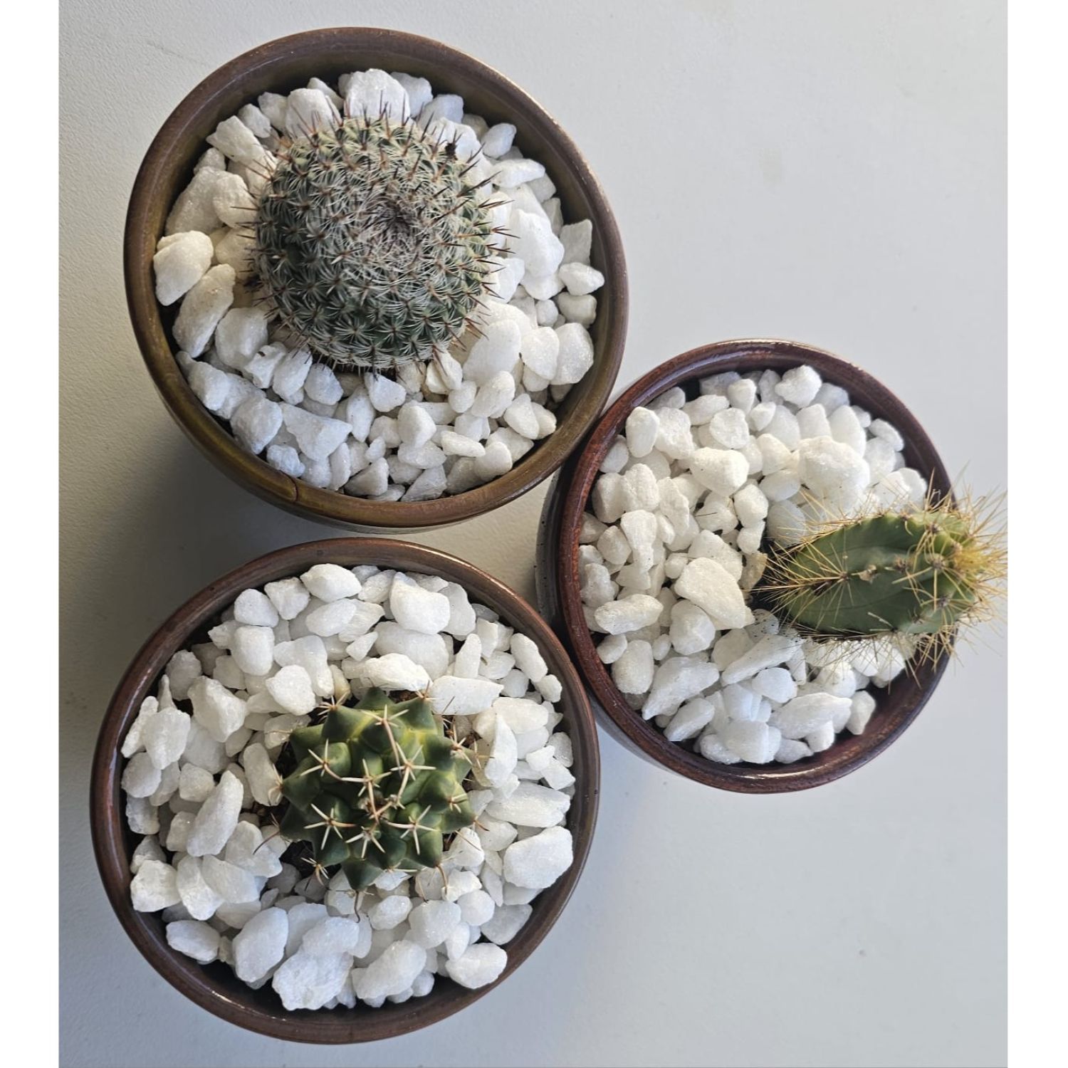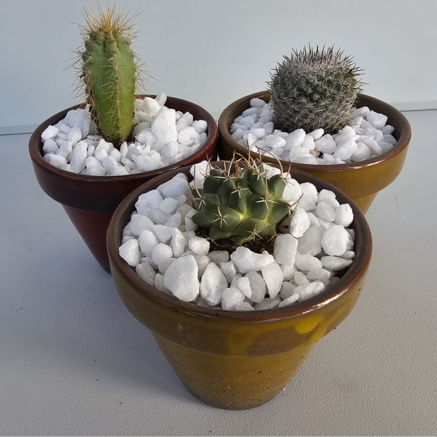Various Cactus plants in glazed colour pots . Decorated with white marble stones. This 3 pot set is idea for windows or as table centerpiece. Easy to maintain and requires limited watering.