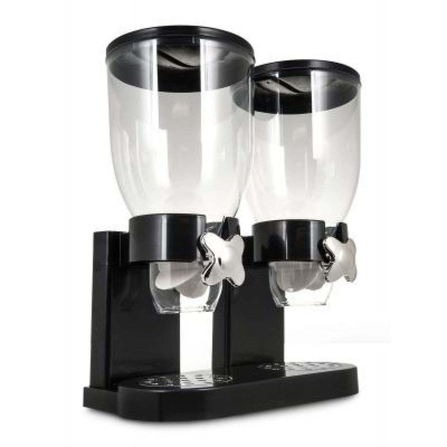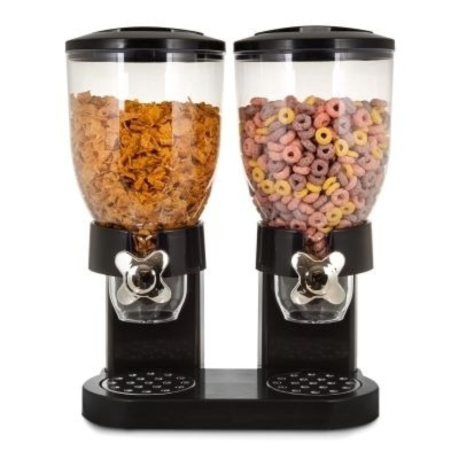 Double Cereal Dispenser Black Kitchen Food Storage Indispensable Dry Food Dispenser Dual Control standard Size Description Double Cereal Dispenser, Black Each plastic container holds up to 17.5 ounces Dispenses standard size portions easily; 1 ounce per twist Doubles as dry food dispenser for nuts, candy, granola and more Preserves freshness for up to 34 days to minimize waste Scratch-resistant and shatterproof construction Promotes kids’ independence and healthy lifestyles Dimensions: 7.5”L x 13”W x 16.3”H Design allows for as needed dispensing, dispenses approxiamtely 1 ounce per twist and keeps food sanitary and germ-free. Suitable for cereal, oatmeal, candy, granola, nuts, beans, rice End cereal box clutter, free up pantry space Kids can serve themselves; avoids waste; easy to fill and clean Each canister holds 1 Gallon or 17.5 ounces of dry food