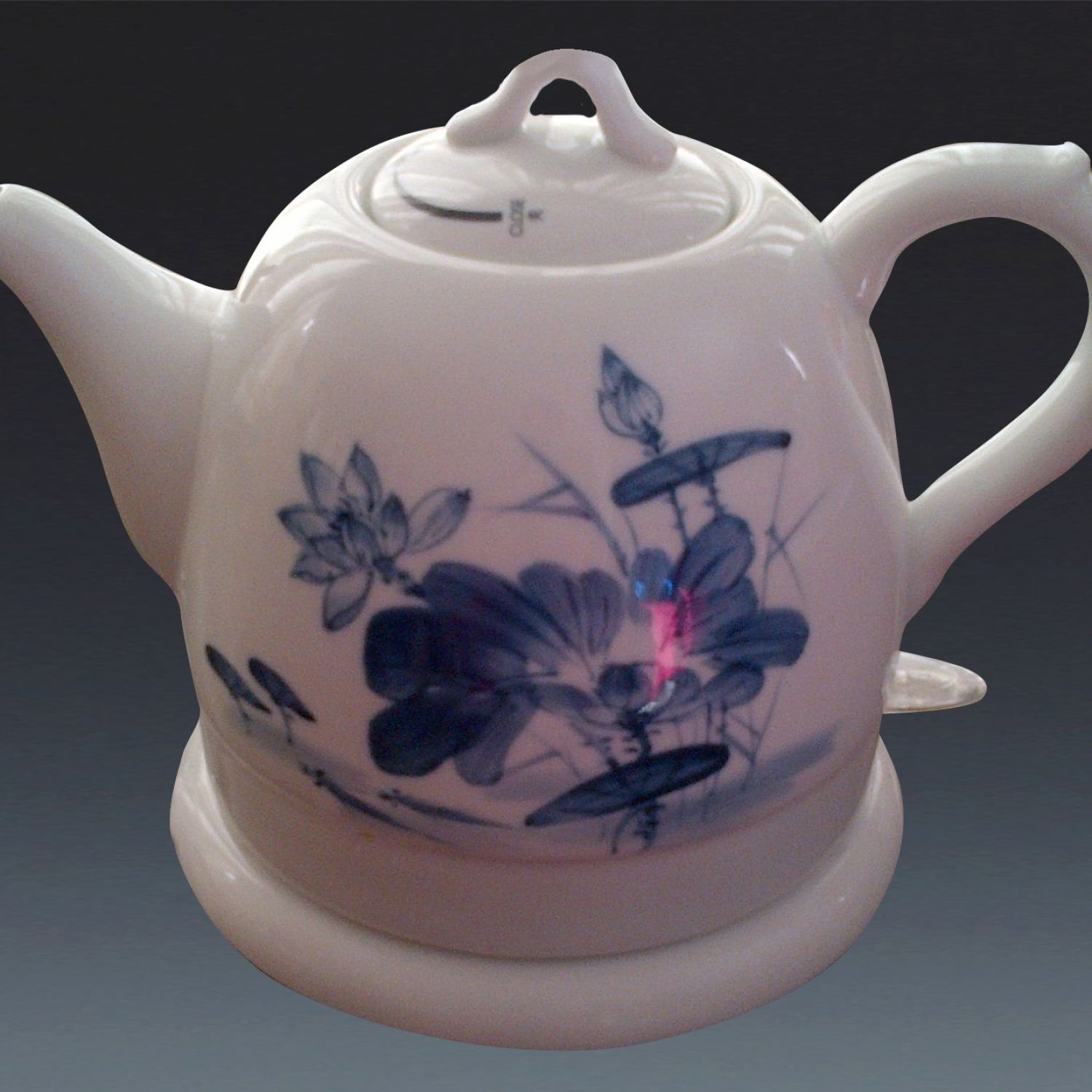Electric Kettle, cordless, 1000 W, 1.2 L, porcelain body, made from the choice kaolin, fired in the 1350 Celsius degrees kiln, white glaze, decal design, the locked lid, helping to improve water quality and benefit your health