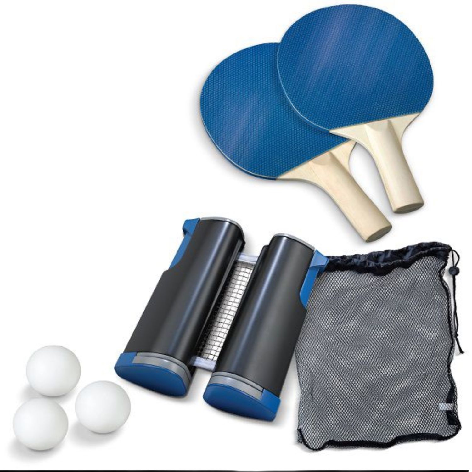 Come with a telescopic net rack, pair table tennis paddle and 3 balls.