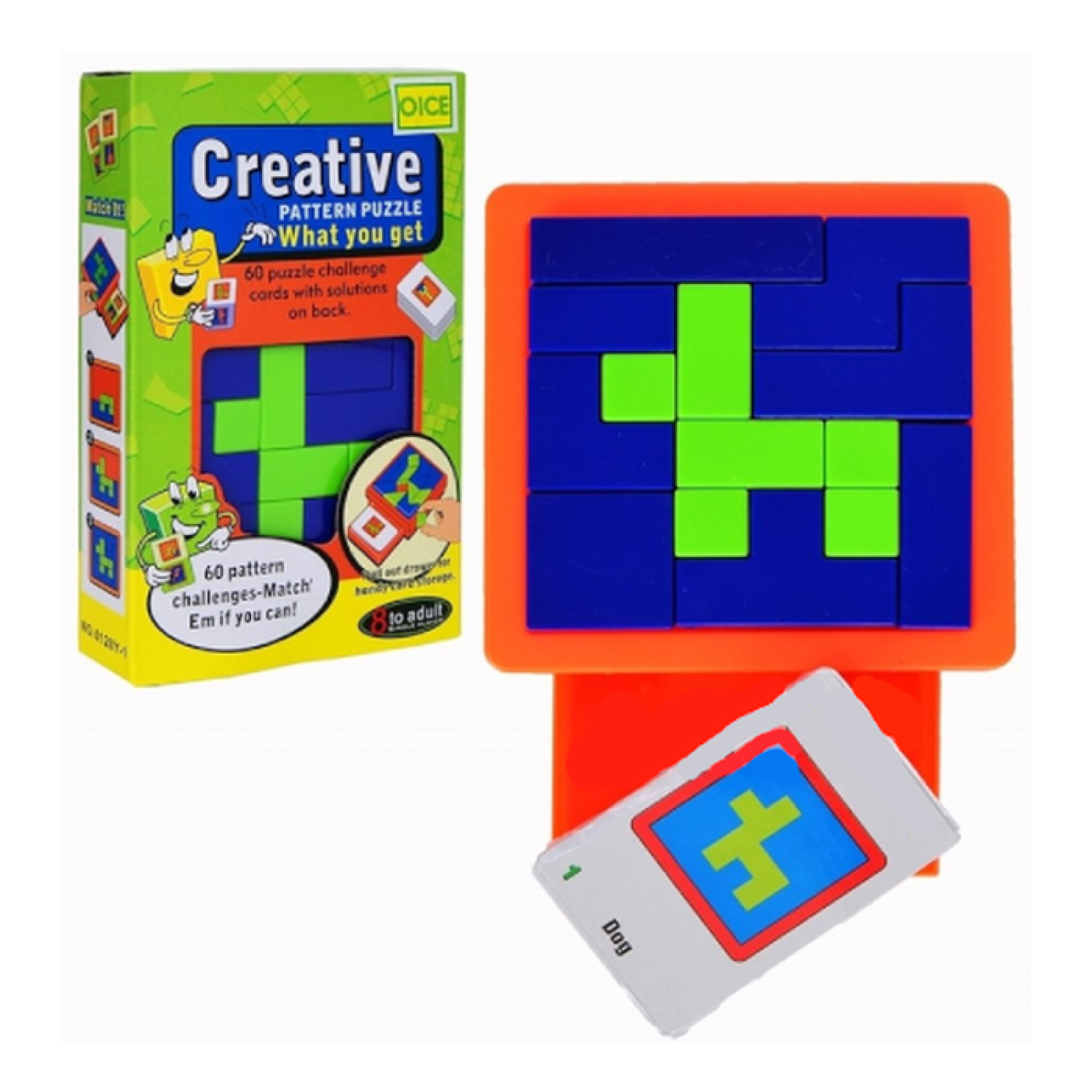 Square by Square is a creative pattern game that teaches spatial reasoning skills. Square by Square is made more difficult because you must fill in the frame in addition to making each shape. Combine the pieces to match and image on one of the 60 challenge cards. Spill the pieces out of the game tray, select a challenge card from the deck and assemble the blue and green pieces to match the image on the card. All pieces must lie flat within the game tray and you can turn or flip the pieces anyway needed to complete the image.