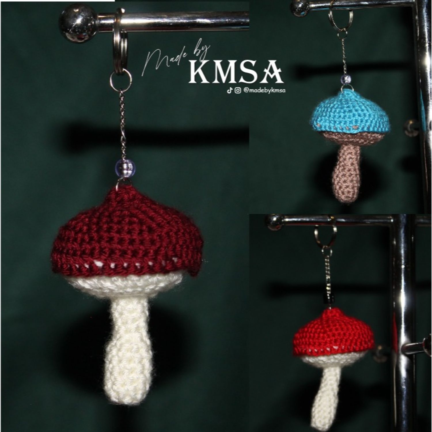 Hand-crocheted mushroom keyrings are available in various colours.