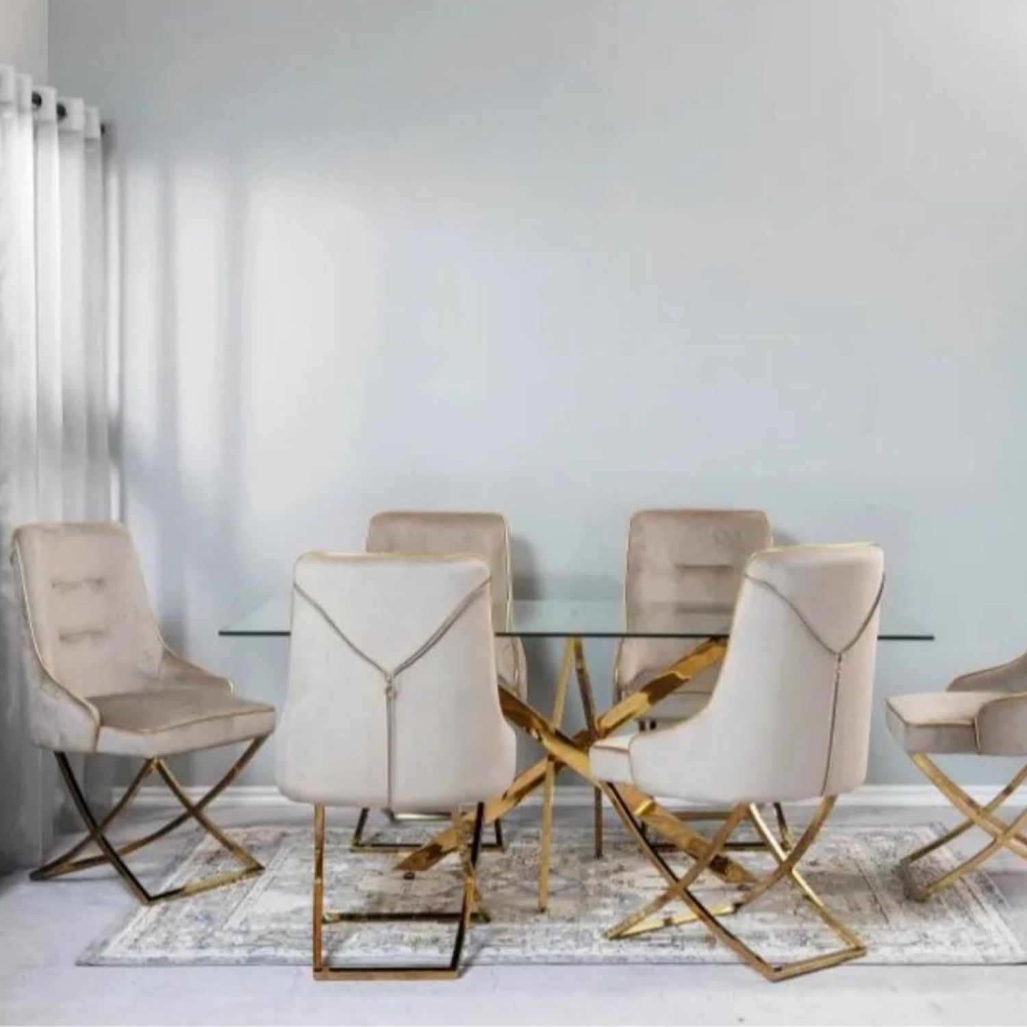 - Add a fresh new look to your dining/ breakfast room with the effortlessly sleek Giselle Contemporary Dining Set. Featuring a crisscross chrome base and a durable round tempered glass table-top. Accompanying the table are 6 Giselle Velvet Zipper dining chairs. Featuring steady gold steel legs with a round black velvet upholstered deeply padded seat.