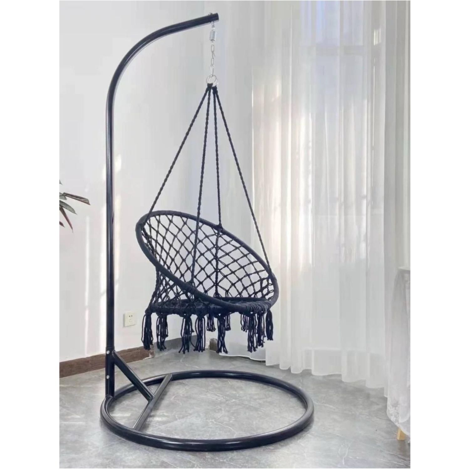 Handcrafted from high-quality cotton, each chair is meticulously woven onto a robust frame to ensure durability and longevity. The arched backrest adds both style and practicality, providing a beautiful and comfortable Macrame Swing experience.