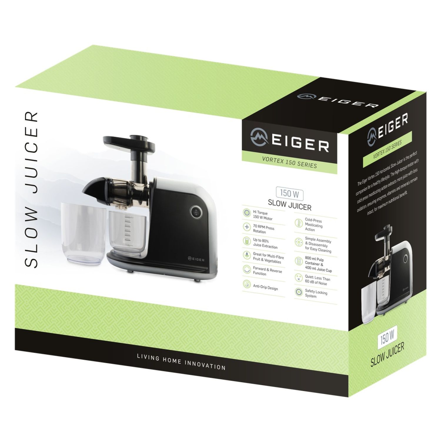 The Eiger Vortex 150 horizontal slow juicer is the perfect companion for a healthy lifestyle. The cold press masticating action allows you to extract more juice with less oxidation, ensuring enzymes, vitamins and minerals remain intact, allowing you to get the maximum nutritional benefit.