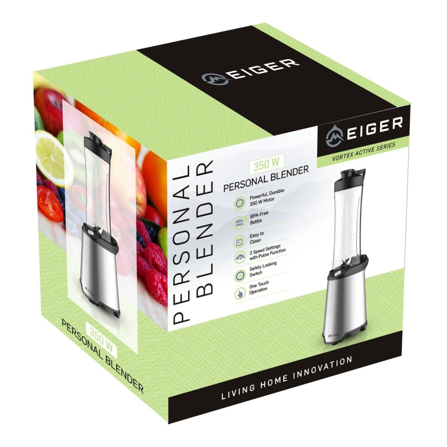 Make healthy, delicious smoothies, frozen juices, protein drinks and more with the Eiger Vortex 350 Personal Blender. Ideal for school, days out, work or the gym - the one-touch blending action allows you to just blend & go, delivering perfect results in seconds. Our powerful 350 W motor smoothly blends frozen berries and ice with juice and other liquids, while the detachable blades and bottle are dishwasher-safe for convenient, easy cleaning.