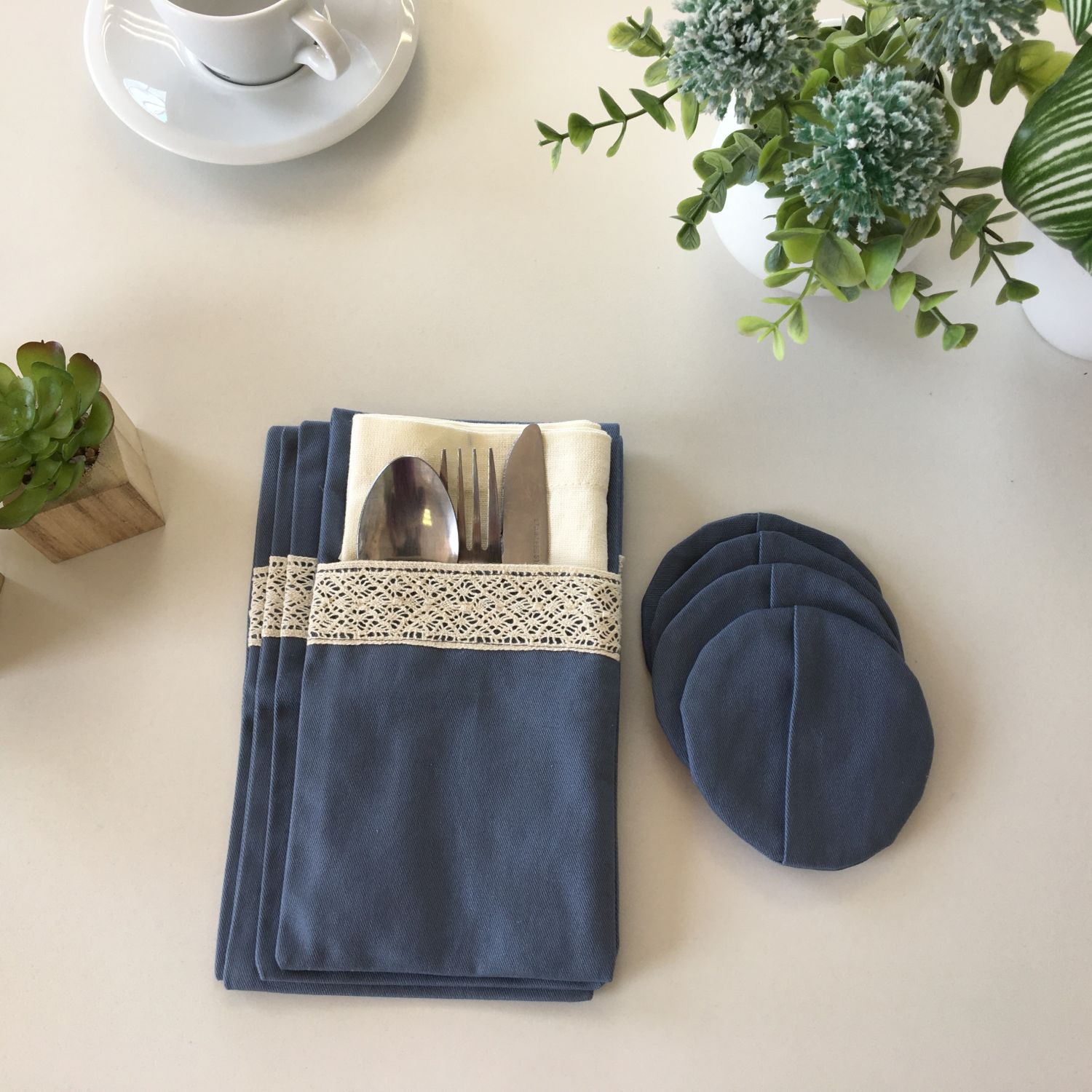 Dress the table to leave a lasting impression with Cutlery Pockets and matching coasters to improve your table setting. It is a set of four pockets that are large enough to carry a cloth napkin and cutlery set. Say No to single use disposables. Get our cutlery pockets and start dining in style today!