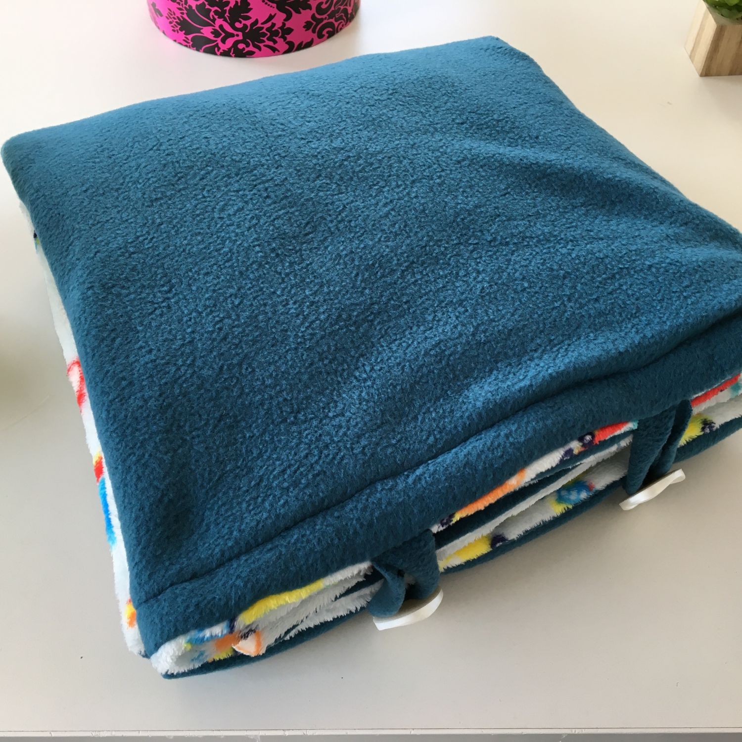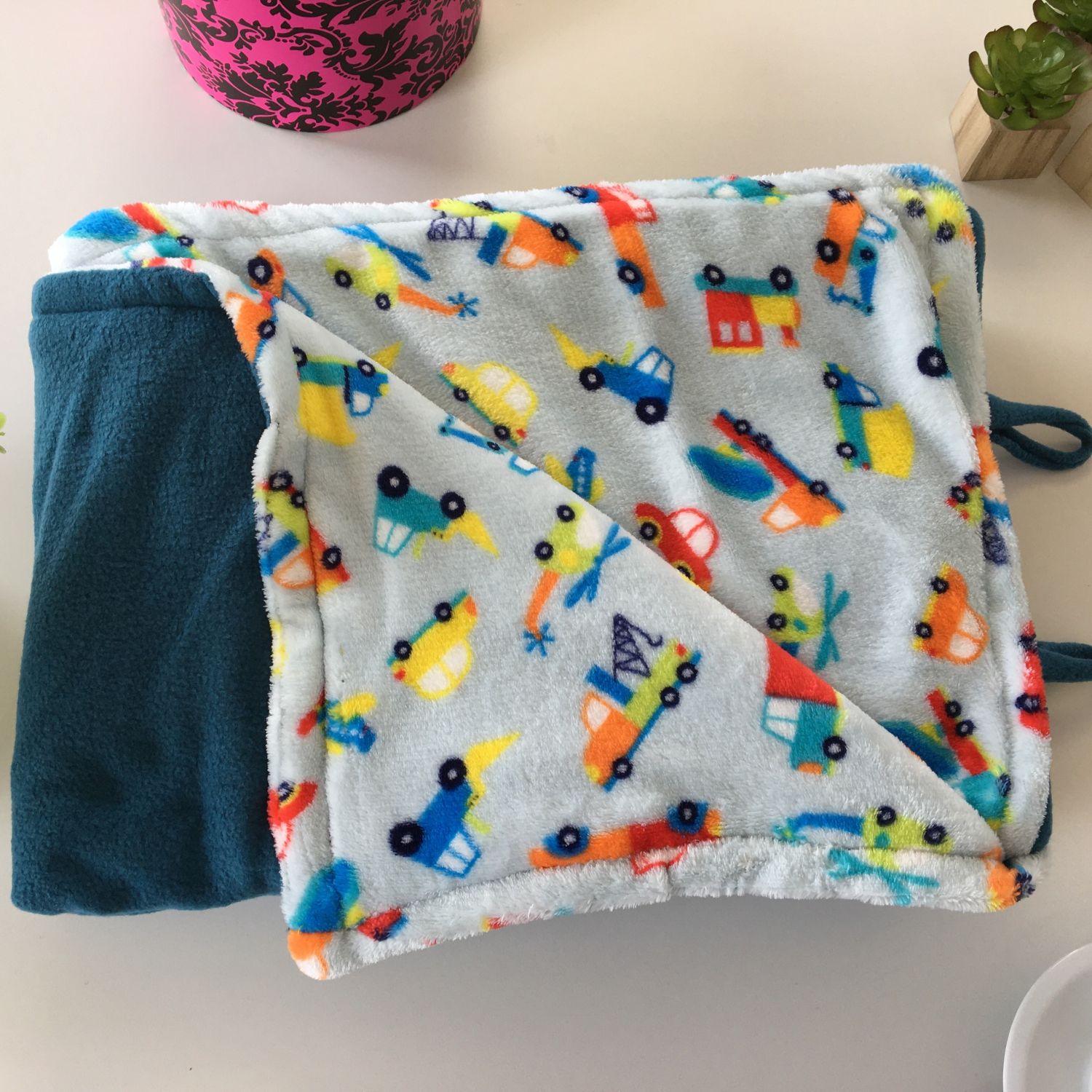 The Teal and Cars print Blankey is reversible for your convenience. It is 140cm x 140 cm large. It is made from high quality fleece for it to last while keeping you warm throughout its life.