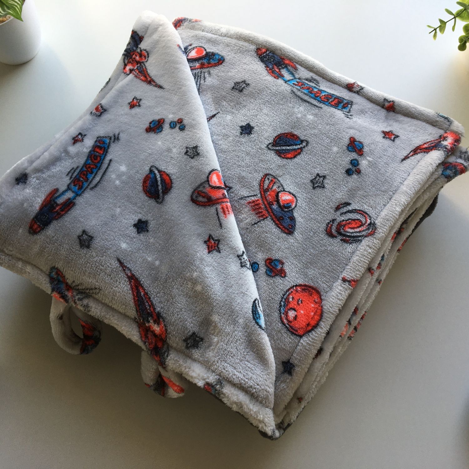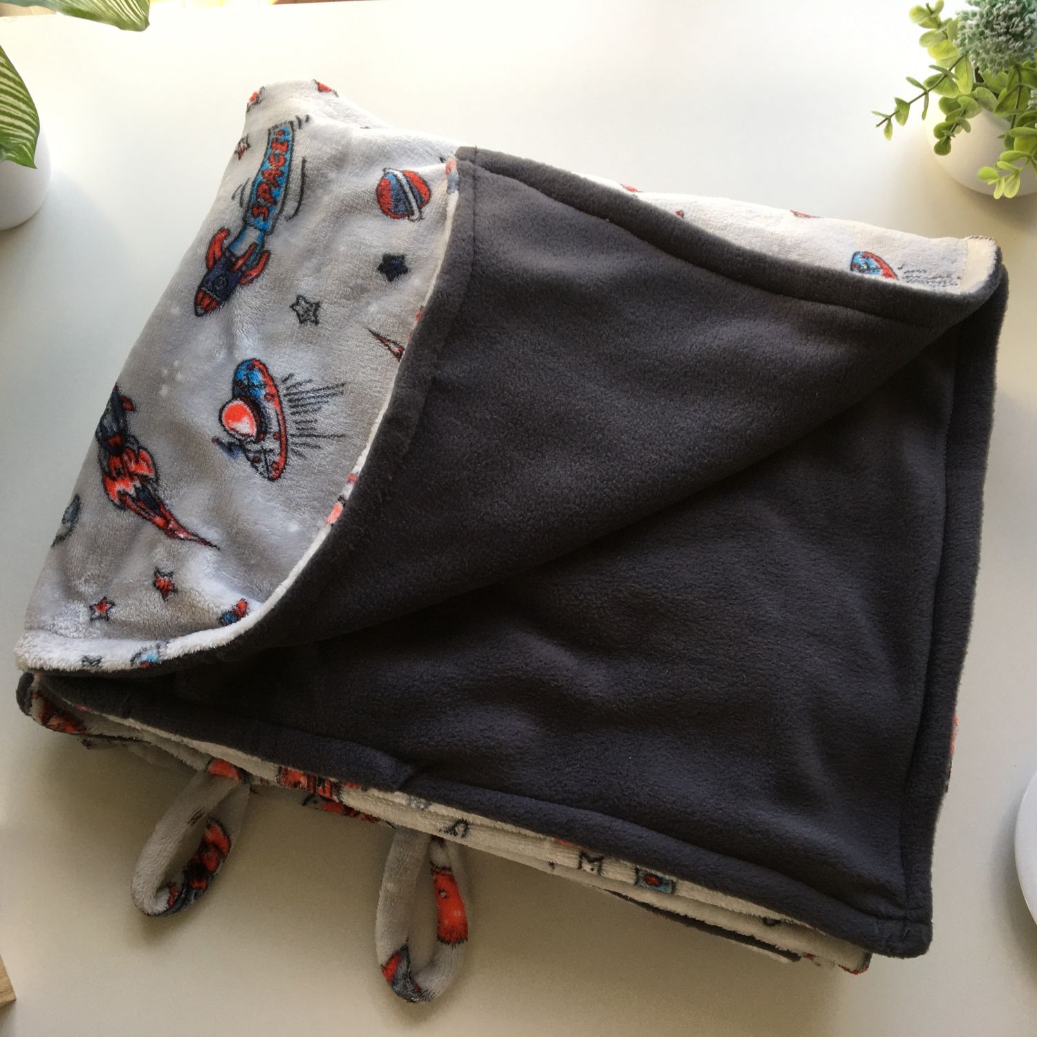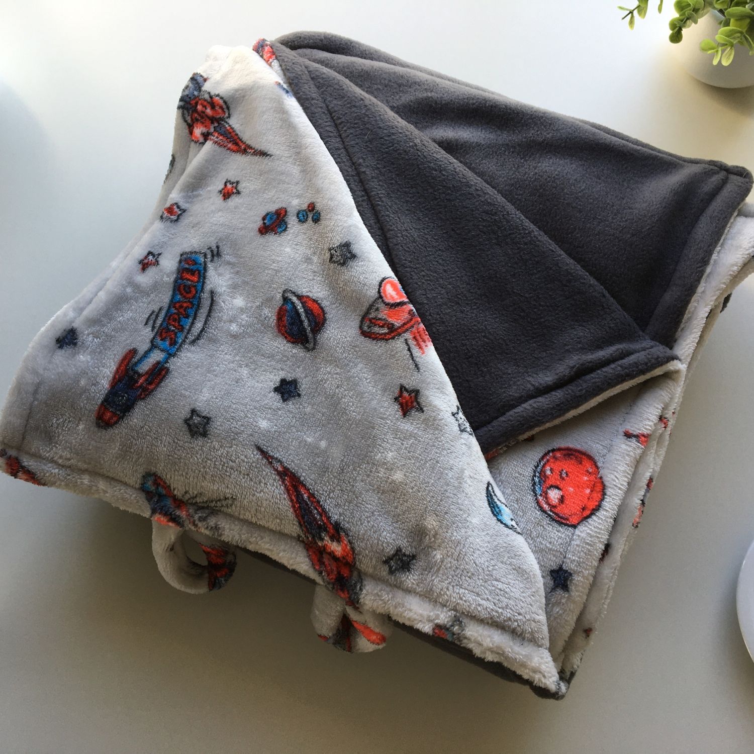 The Grey with space ship print Blankey is reversible for your convenience. It is 140cm x 140 cm large. It is made from high quality fleece for it to last while keeping you warm throughout its life.