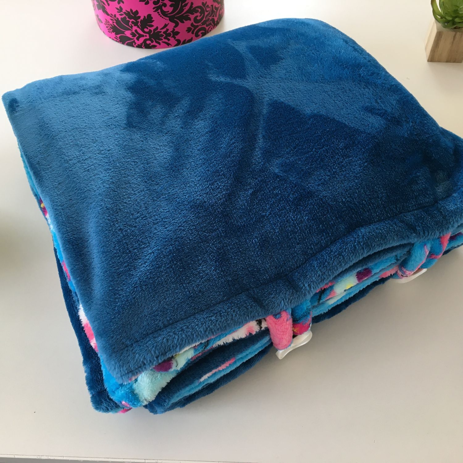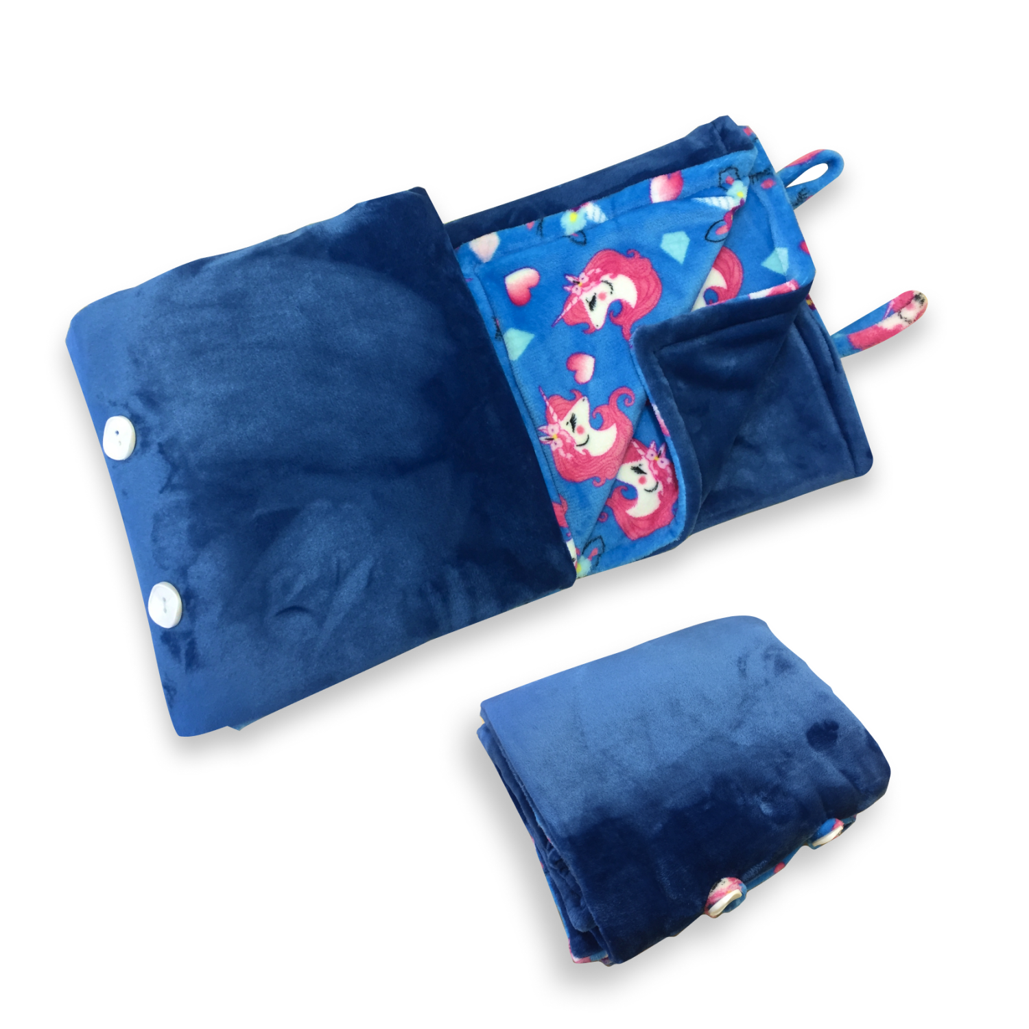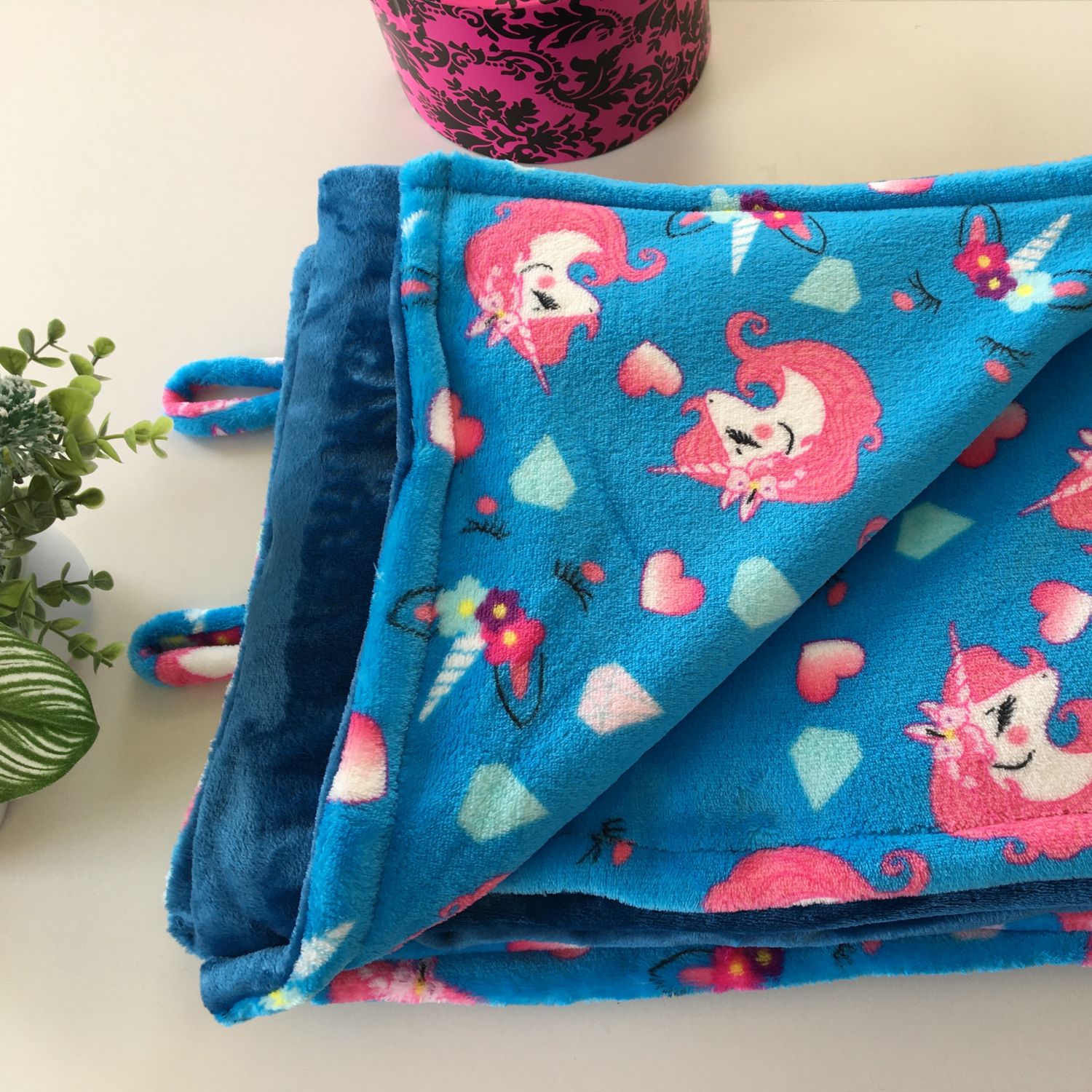 The Blue with Unicorn print Blankey is reversible for your convenience. It is 140cm x 140 cm large. It is made from high quality fleece for it to last while keeping you warm throughout its life.