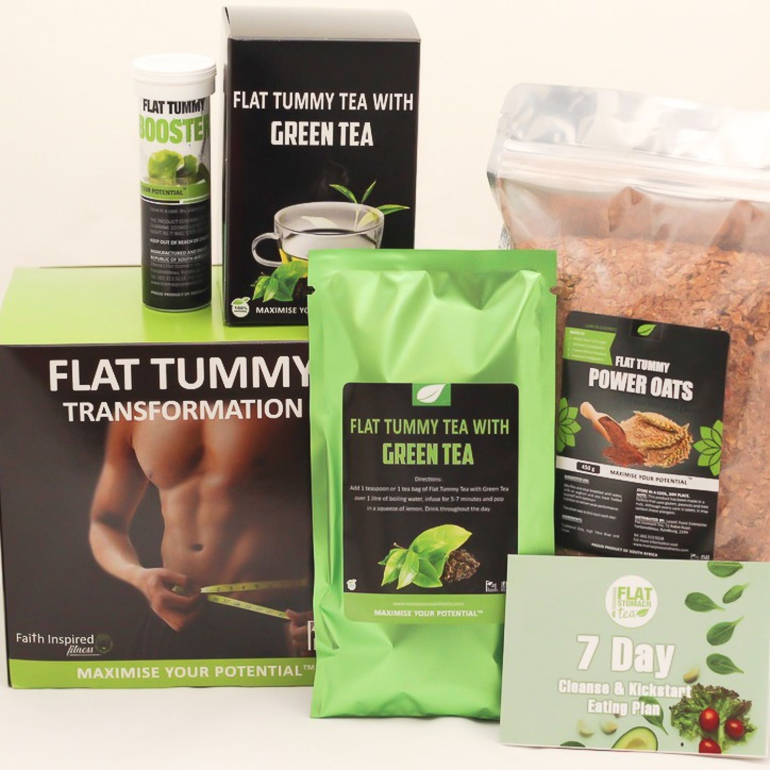 The Flat Tummy Transformation box is a combo that contains one Flat Tummy Tea pack with Green Tea, one 7days Flat Tummy Booster tube and one Flat Tummy Power Oats packet 500g. The combo is a 28 day program and is designed to kick start your journey towards a beautiful flat stomach. Also includes a FREE meal planer leaflet.