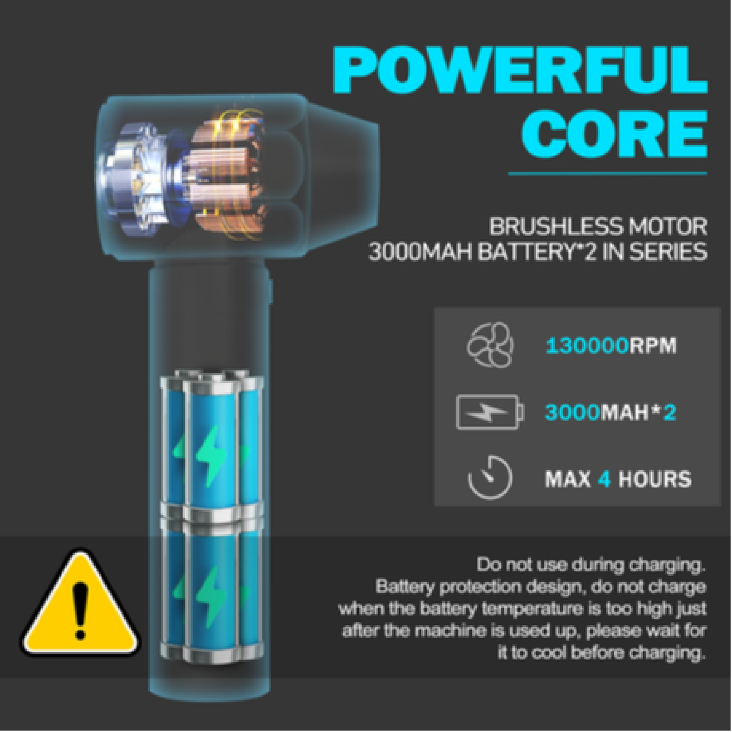 - Rechargeable & Long-Lasting: Powered by a 7.2V 4000mAh battery (2 x 21700 batteries), this air blower provides up to 120 minutes of use on a single charge. The Type-C charging port ensures fast charging, so you're always ready for your next task.