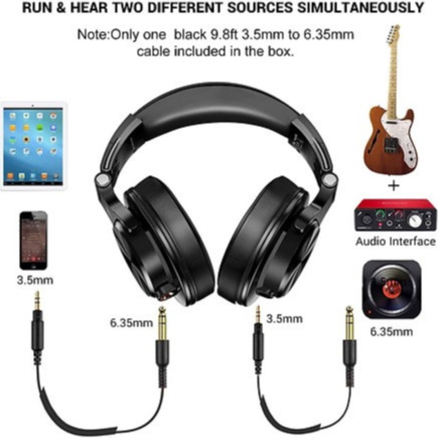 A standard-sized 6.35mm plug, a 3.5mm plug and a 3.5mm splitter cable adapter are included. Compatible with all devices have 3.5 or 6.35 audio jack, like smartphone, laptop, PC, PS4, Xbox One, AMP, electric guitar/piano/drum, etc