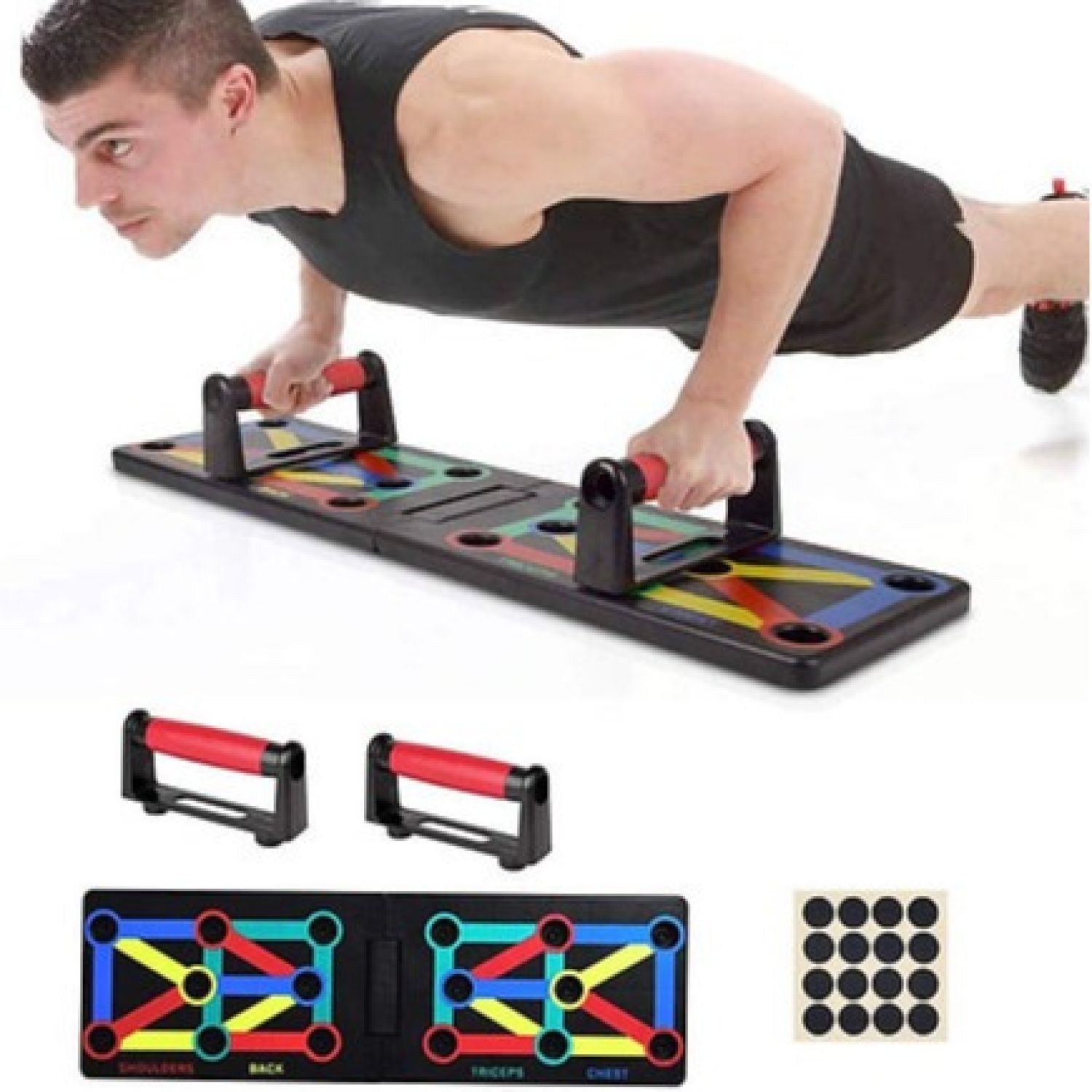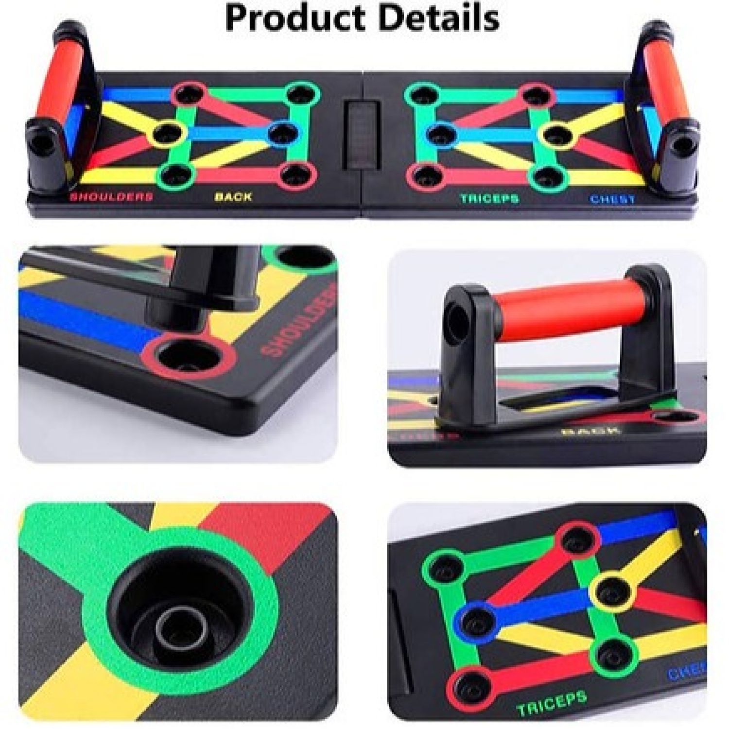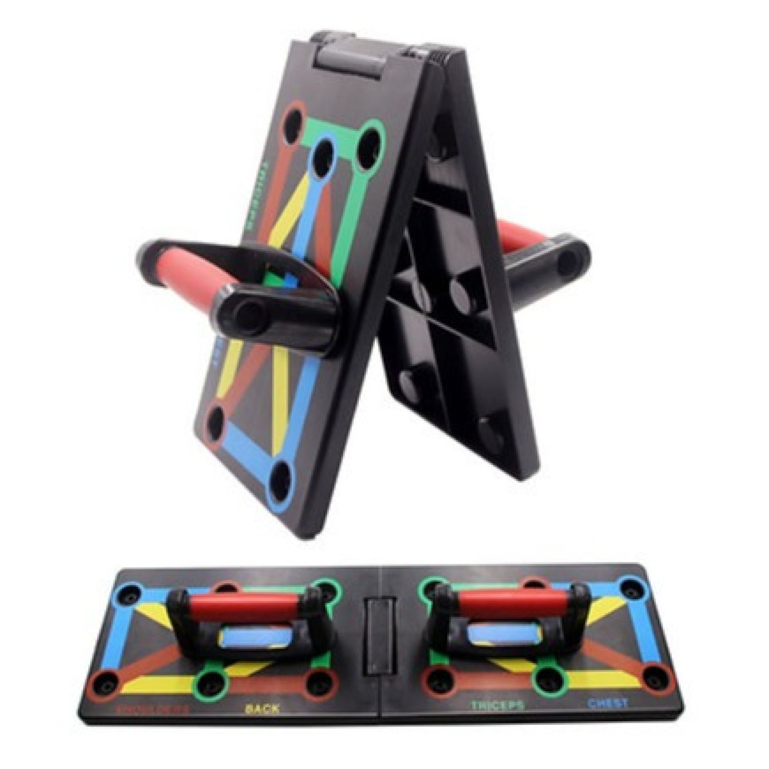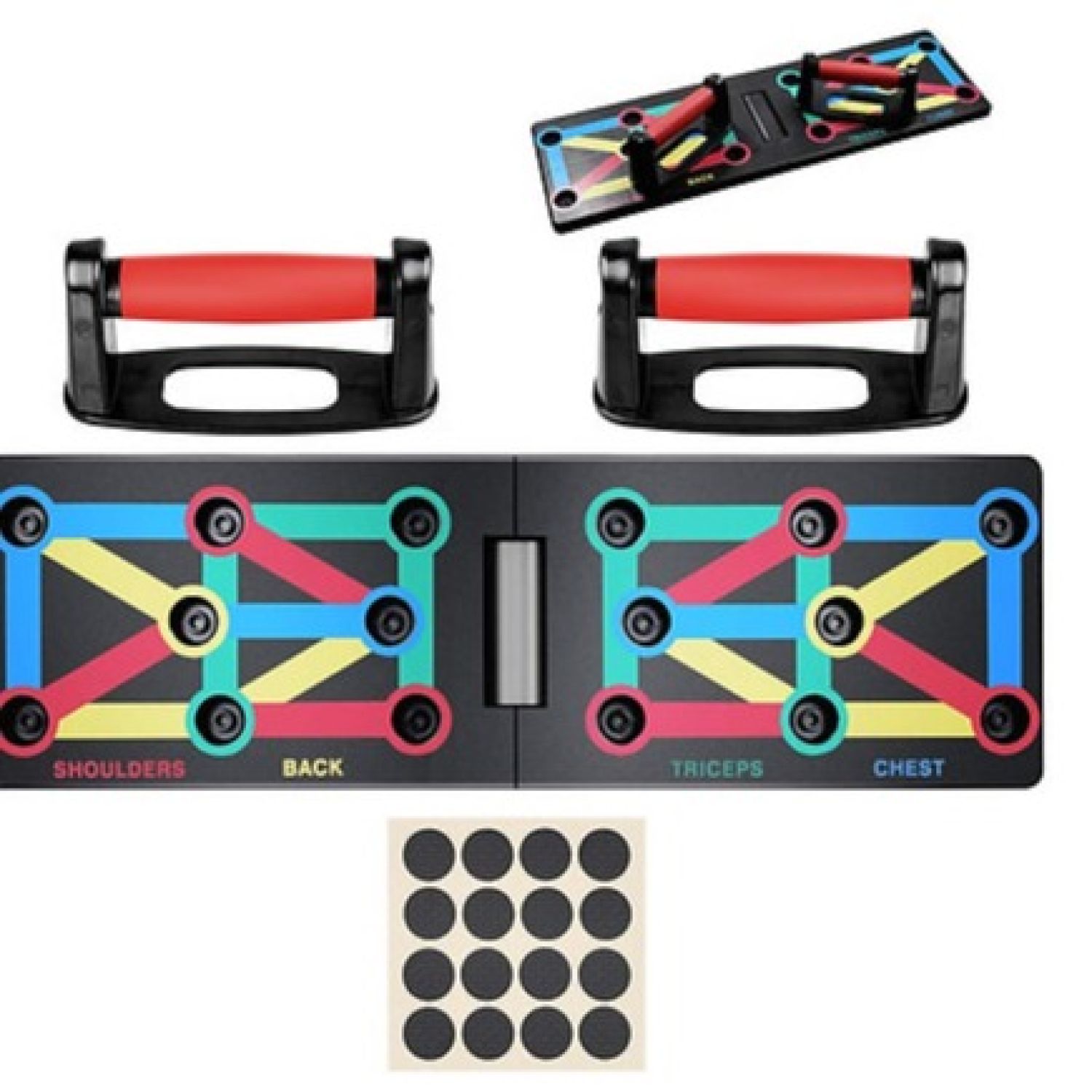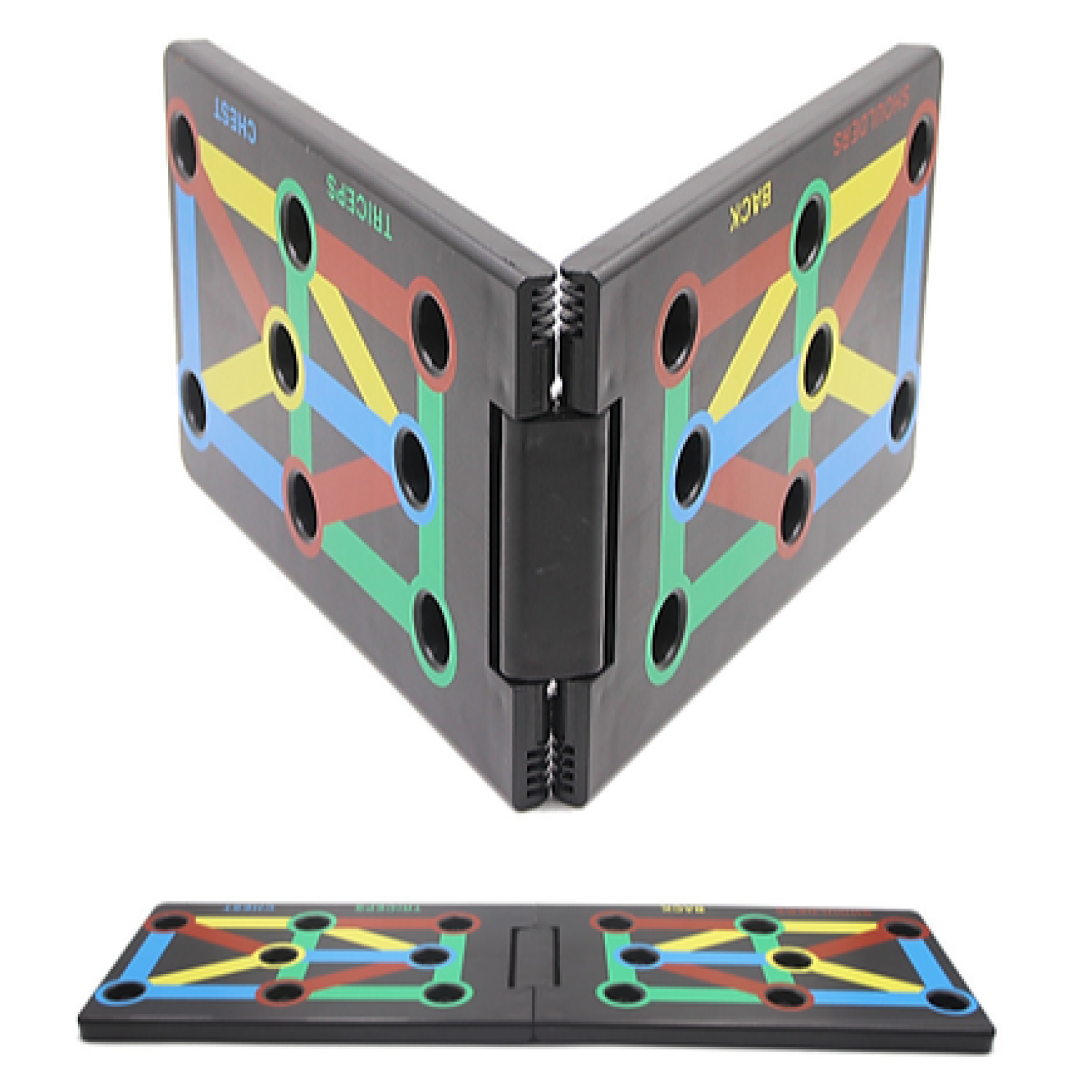 This push-up board is an innovative color-coded push-up board training system that can train muscle groups-hands, chest, abdomen, hips, shoulders, back and triceps.