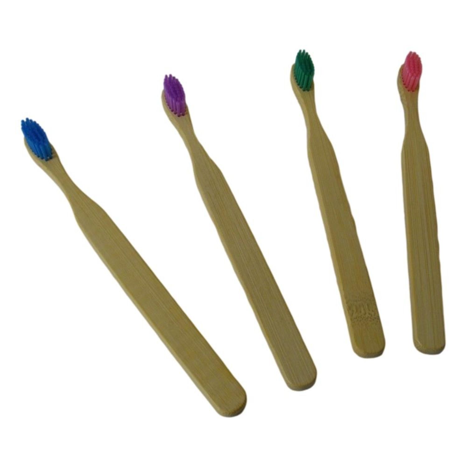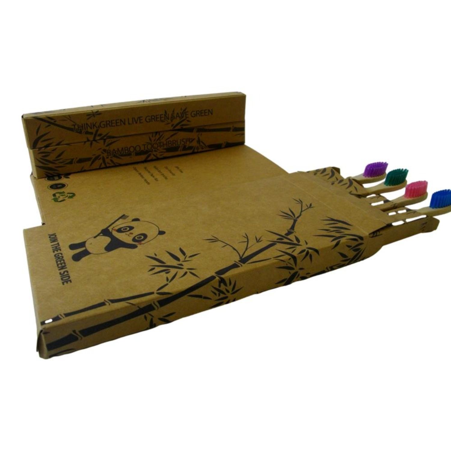 Toothbrush set, 4 pcs/set, medium, adult; Nylon 610 bristles are BPA free, soft, charcoal-infused and 4 colors: one pink/one violet/one blue/one green; Flat style bristle; Organic bamboo handles are completely biodegradable , water resistant, light, stromng and durable; Recycled paper box, each piece individually packed in one small box; Think green, live green, save green!