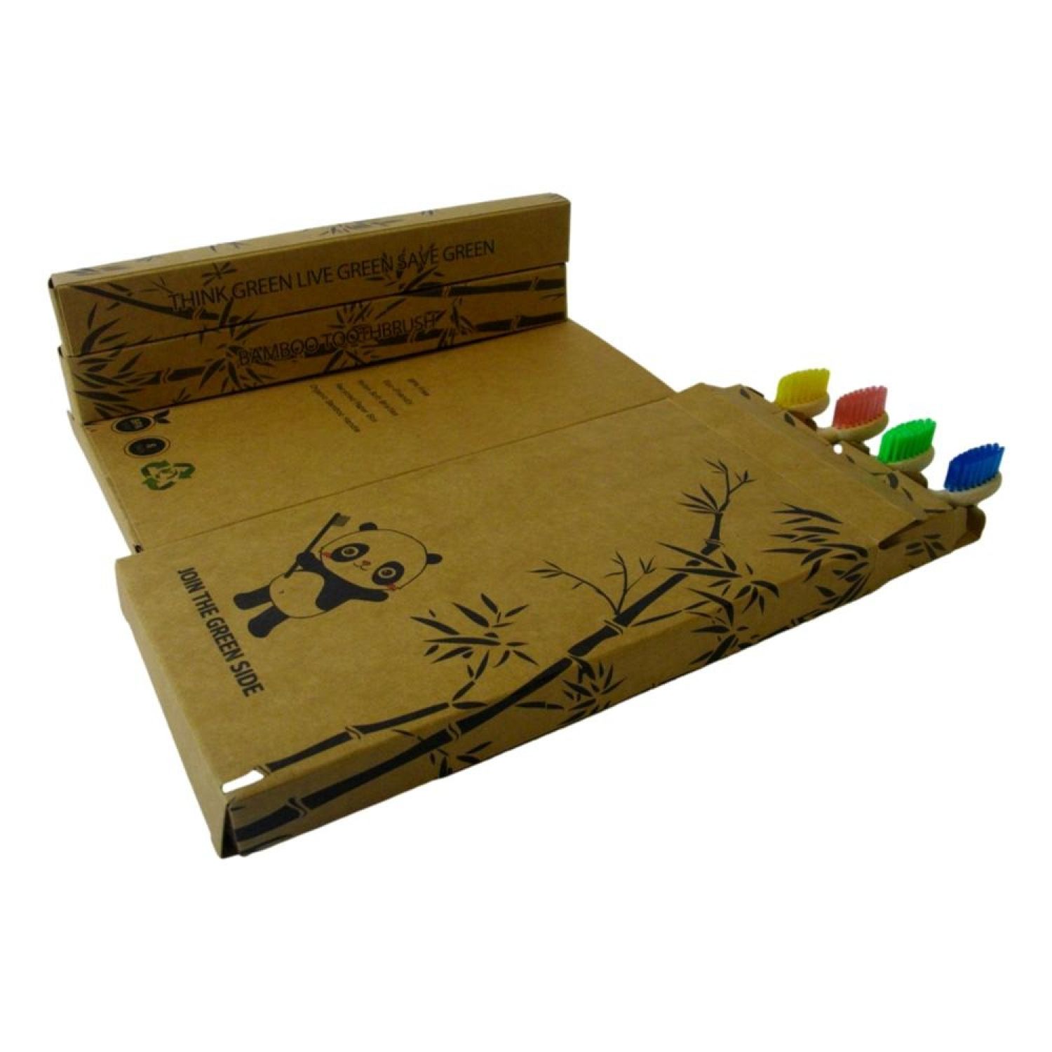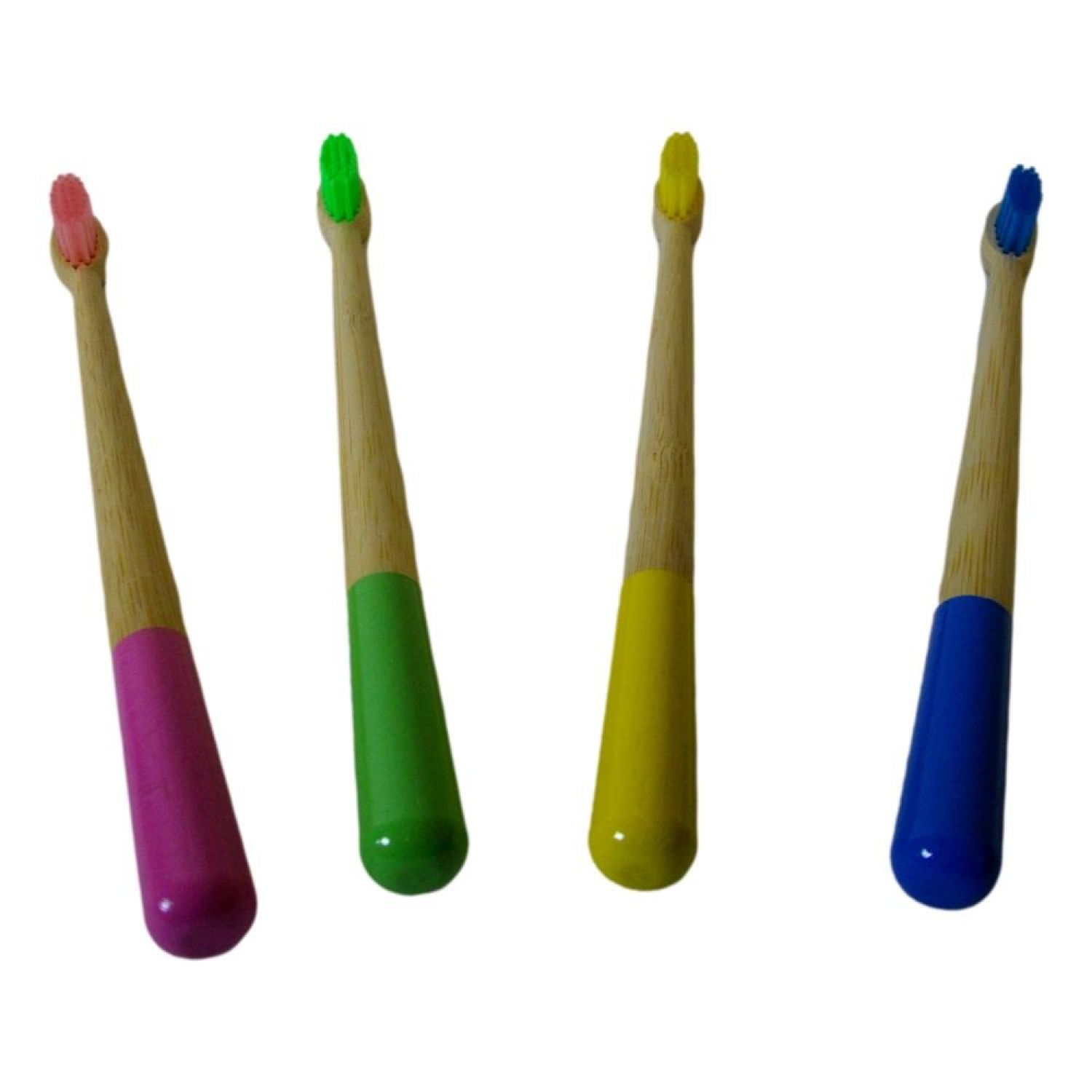 Toothbrush set, 4 pcs/set, medium, adult; Nylon 610 bristles are BPA free, soft, charcoal-infused and 4 colors: one fruit green/one violet/one yellow/one rose; Flat style bristle; Organic bamboo handles are completely biodegradable , water resistant, light, strong and durable; Handle end painting the matching color with the bristle; Recycled paper box, each piece individually packed in one small box; Think green, live green, save green!