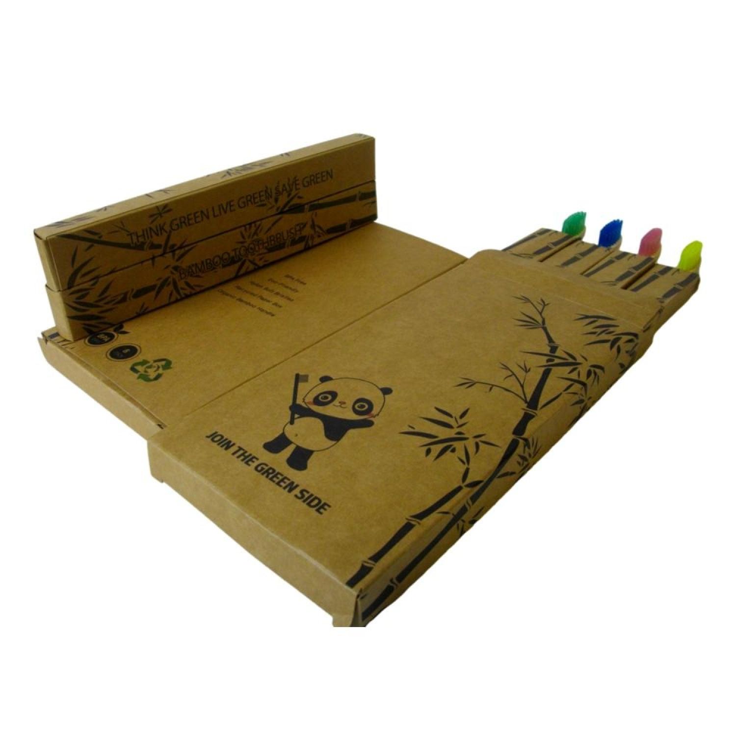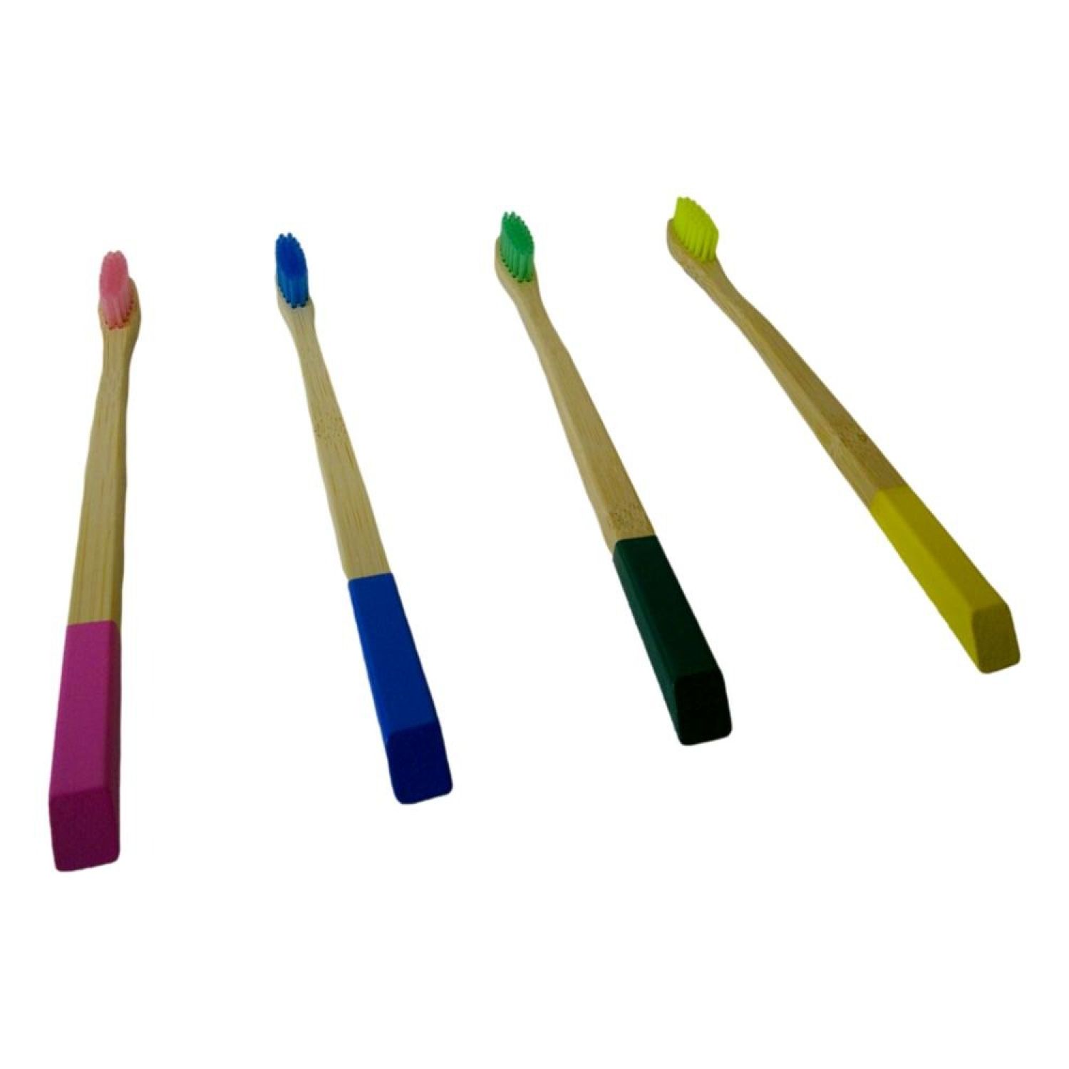 Toothbrush set, 4 pcs/set, medium, adult; Nylon 610 bristles are BPA free, soft, charcoal-infused and 4 colors: one pink/one yellow/one blue/one fruit green; Flat style bristle; Organic bamboo handles are completely biodegradable , water resistant, light, strong and durable; Handle end paiting the matching colour with the bristle; Recycled paper box, each piece individually packed in one small box; Think green, live green, save green!