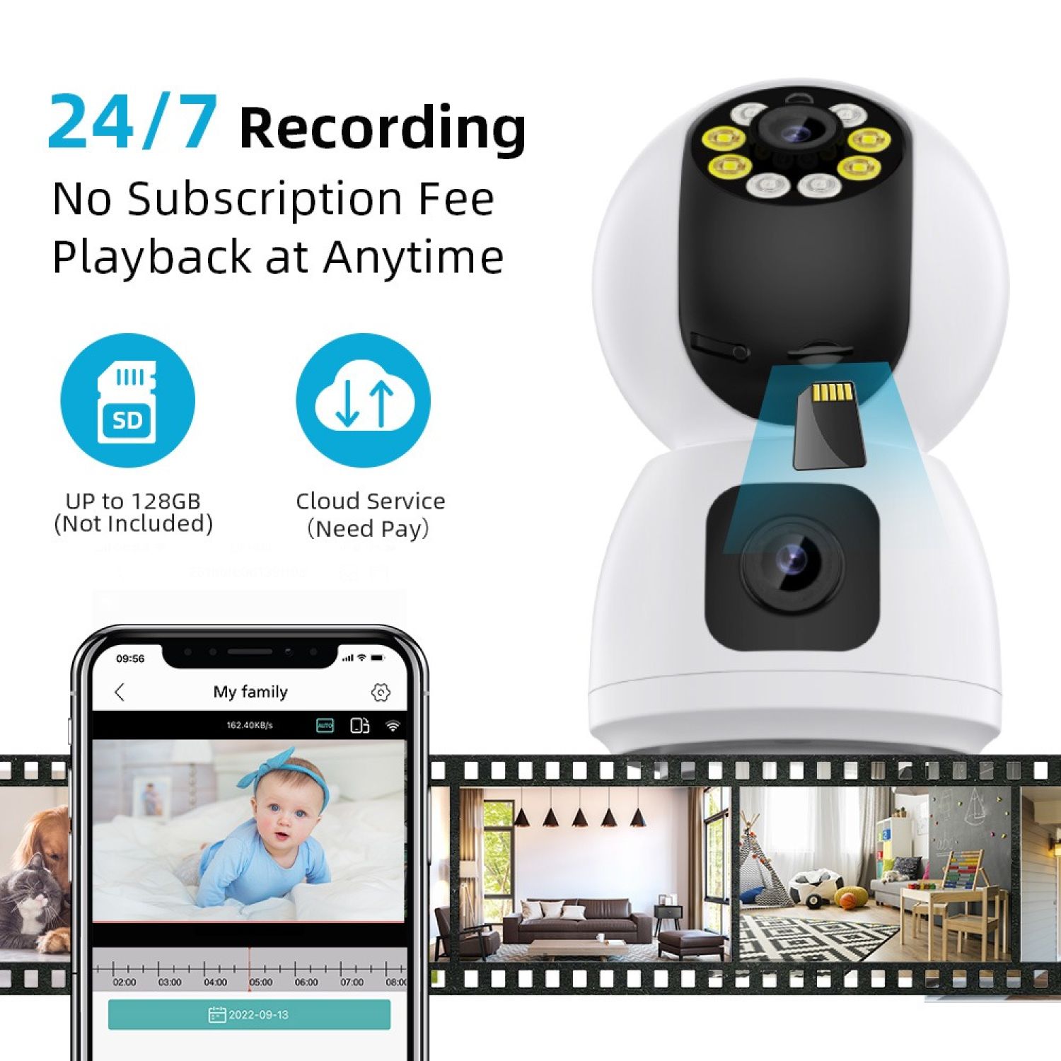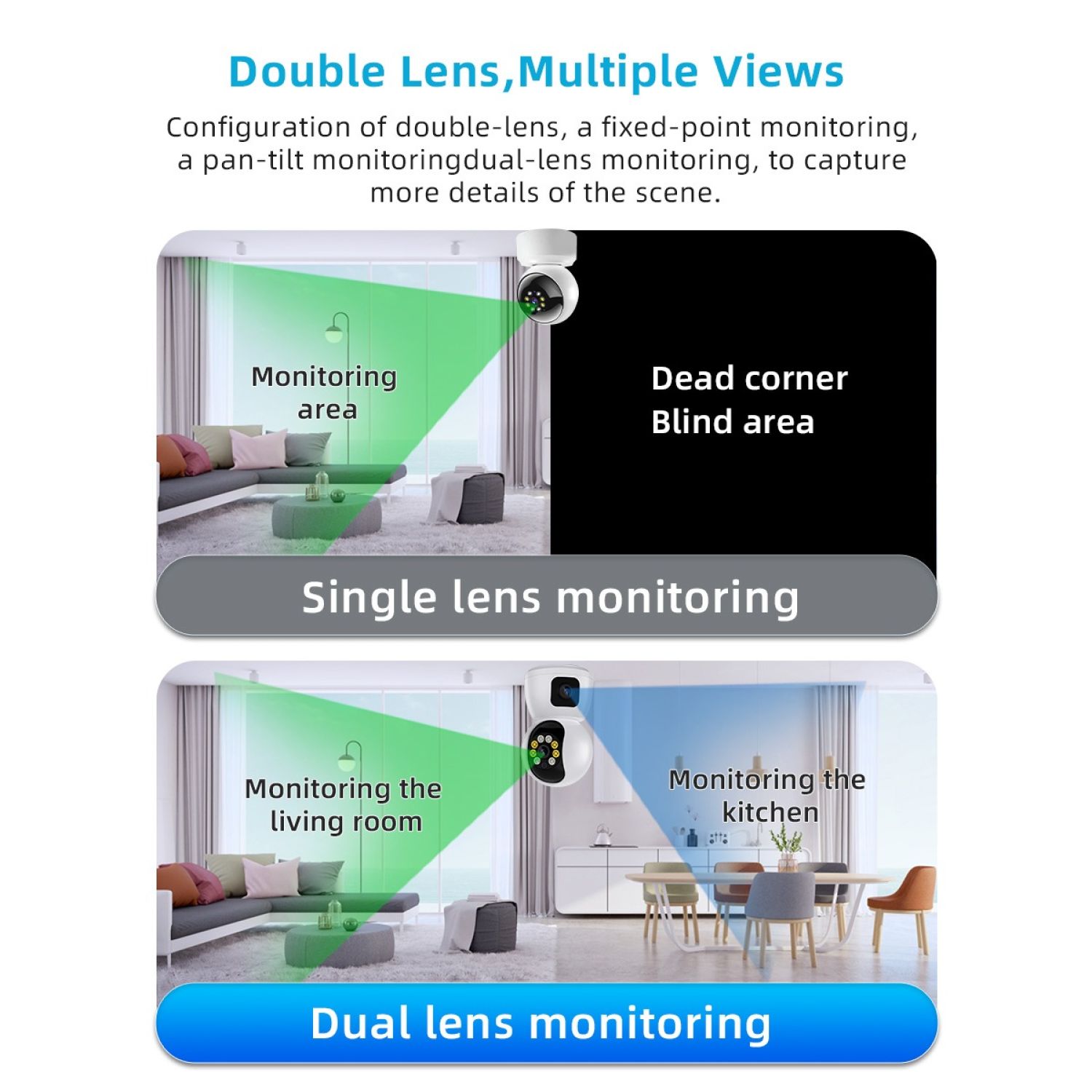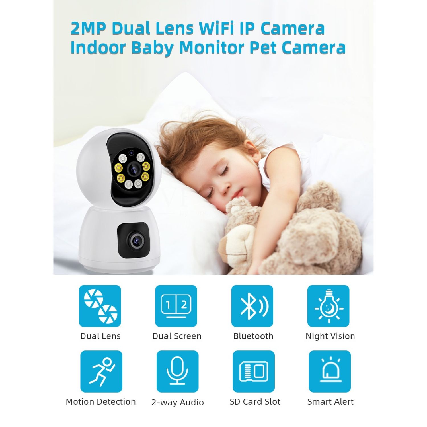 HD Wifi Dual Lens(2MP & 2MP) Camera Night Vision SD card and cloud recording capability Multiple User access Monitoring via App from anywhere Smart Alert with LED light 2-way Audio Lan port cable Easy to set up
