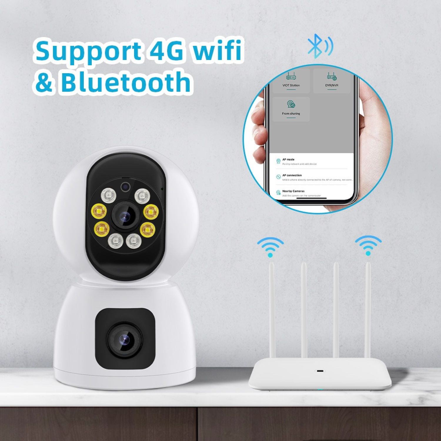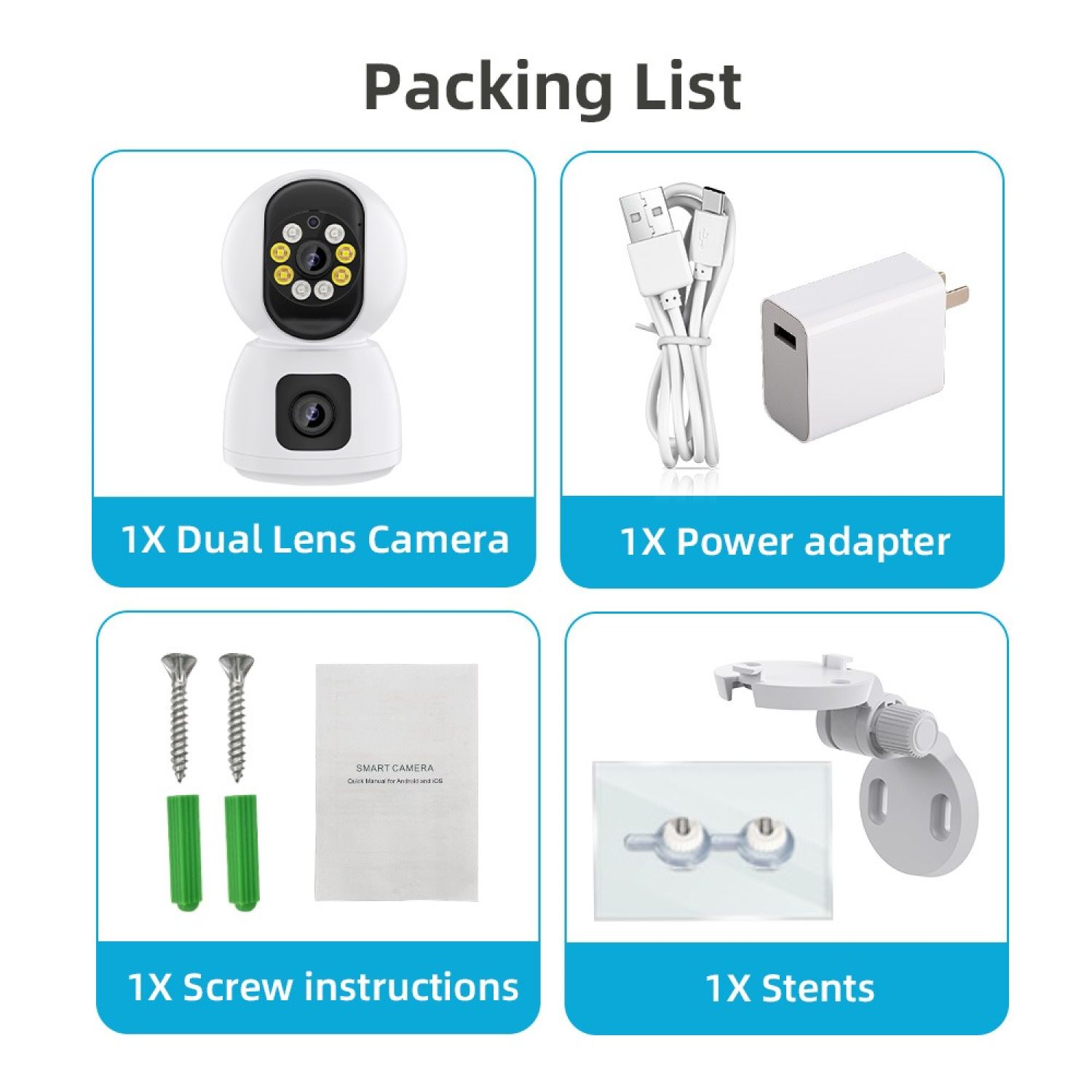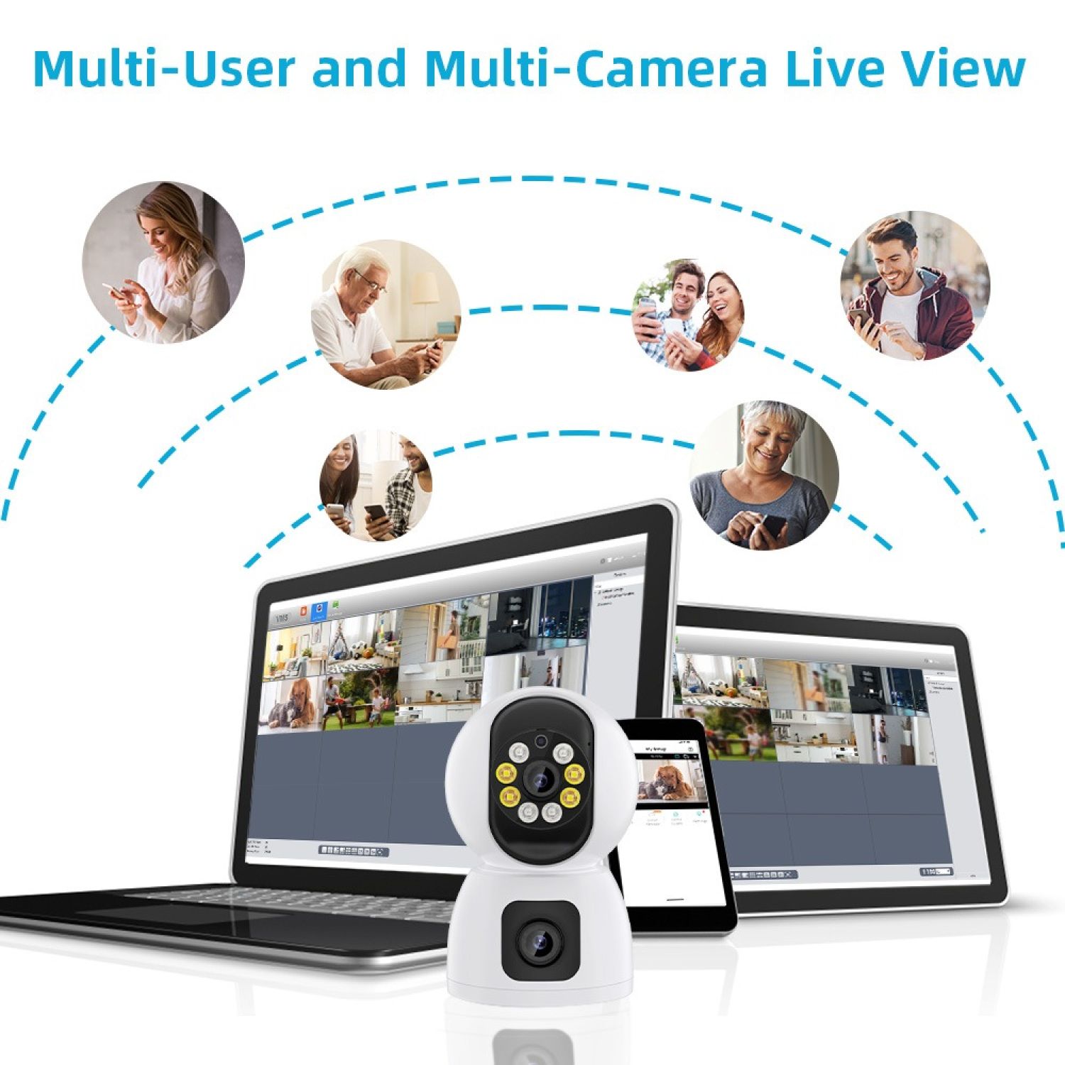 HD Wifi Dual Lens(2MP & 2MP) Camera Night Vision SD card and cloud recording capability Multiple User access Monitoring via App from anywhere Smart Alert with LED light 2-way Audio Lan port cable Easy to set up