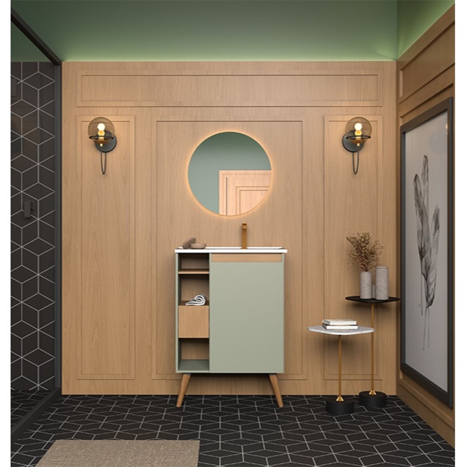 The Lotus wooden bathroom is versatile and stylish. In both sizes, it has an internal shelf, telescopic slides that allow the drawer to open completely, cushioned hinges that prevent impacts and wooden feet in the options with feet. Offers synthetic marble washbasin in the 60 cm version.