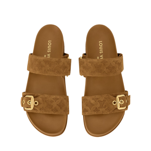 The Bom Dia flat comfort mule is revisited this season in suede goat leather with Monogram perforations, coordinating with the Mahina leather goods line. Both stylish and practical, this model features two adjustable straps: one with velcro, the other with a Louis Vuitton-engraved buckle. Its padded anatomic insole offers all-day comfort.